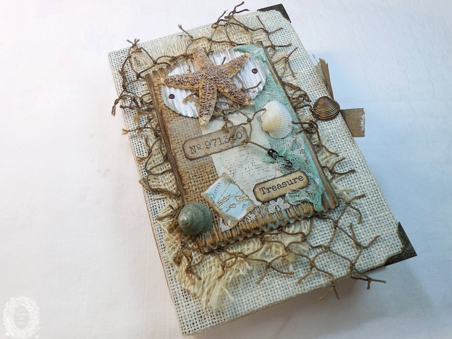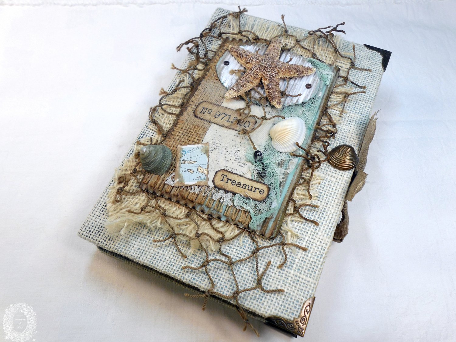 Vintage Day at the Beach is a fabric-covered journal that has 120 writing pages, 3 tags, 14 pockets, 26 journaling cards, 5 envelopes, 4 special ephemera, 5 signatures, measures 9.5 inches tall x 6.5 inches wide x 1.75 inches thick, and has an authentic starfish and seashells on the cover.
