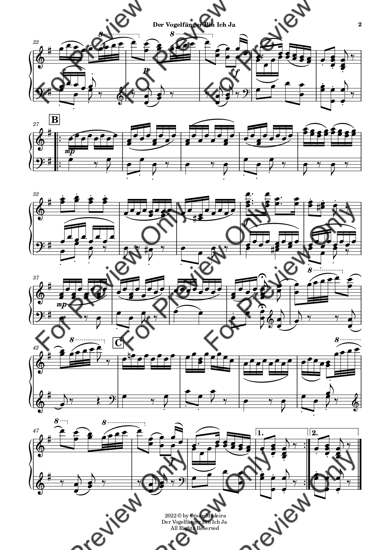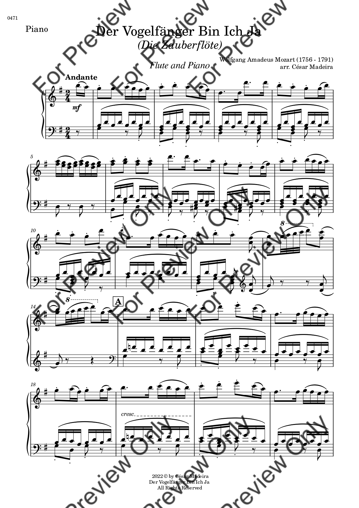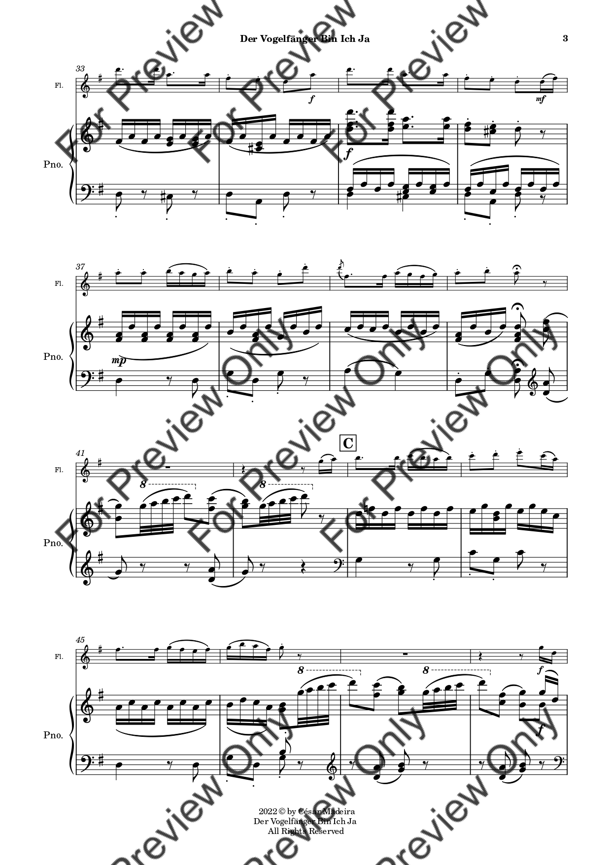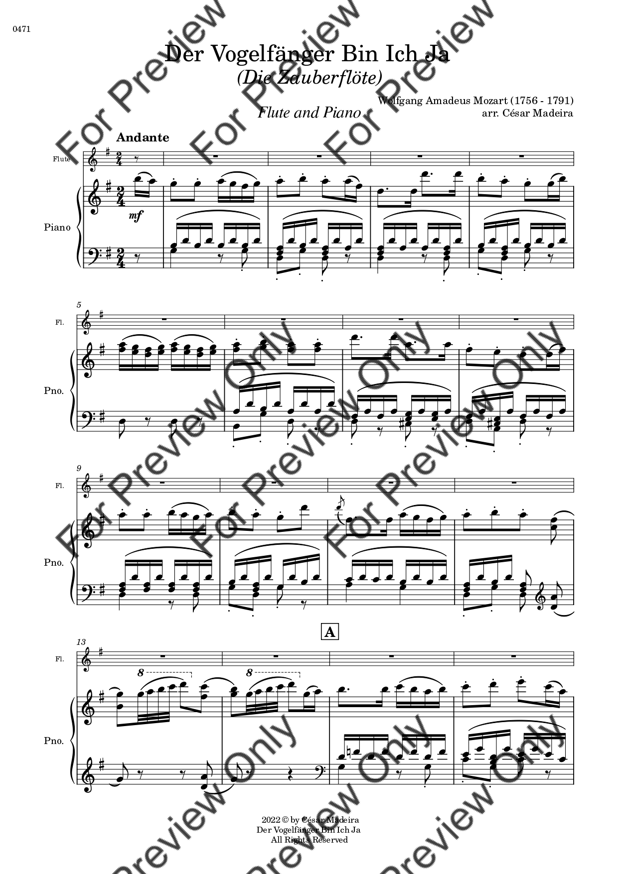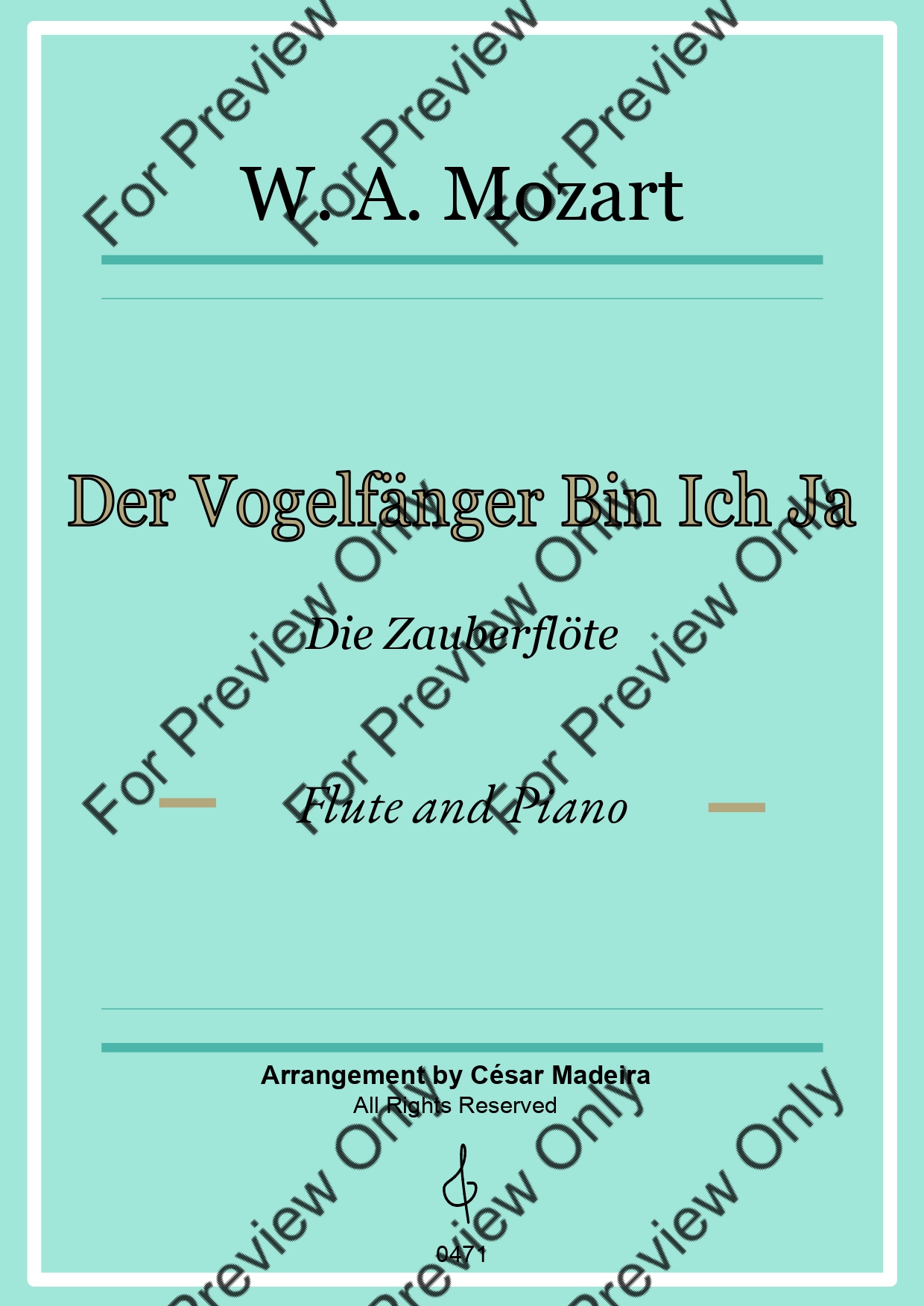 Der Vogelfänger Bin Ich Ja from Die Zauberflote (The Magic Flute) by Wolfgang Amadeus Mozart. Arrangement for Flute and Piano. With Full Score and Individual Parts. Have fun!