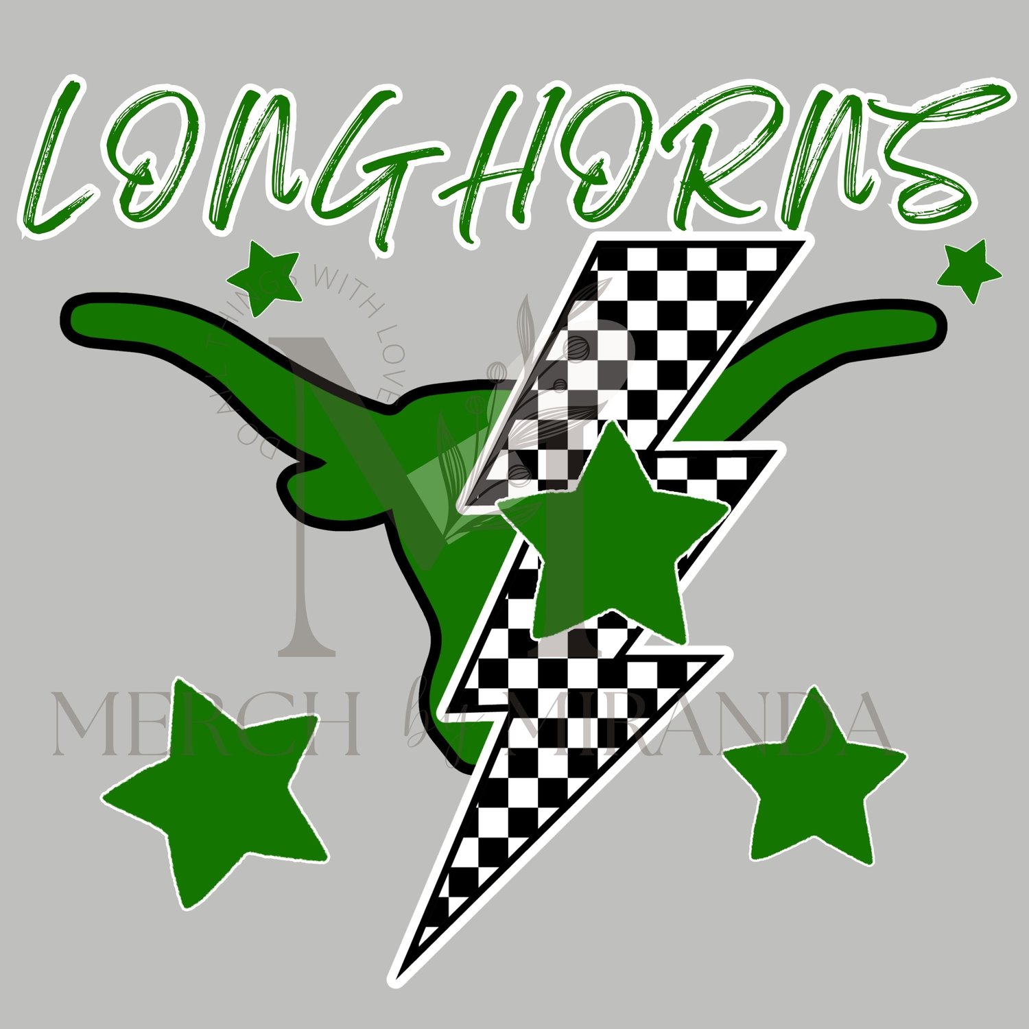 Longhorn Mascot Green | Sublimation Design | Digital Download | School Spirit Shirt PNG | DTF Design | Lightning Bolt-Checkered with Stars - Longhorns