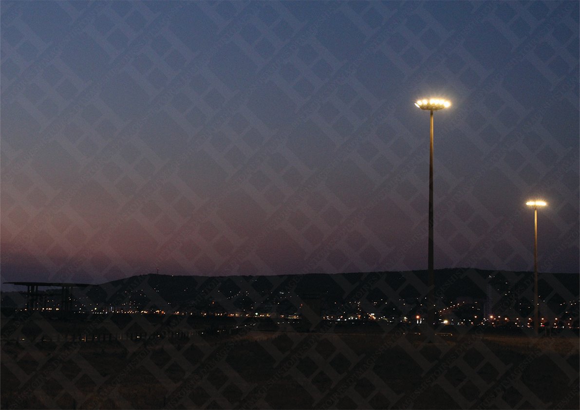 An artistic composition of the coast of Figueira da Foz in Portugal. The city lights stretch along the coast to the hills and their villages, all illuminated by the soft light of late sunset.