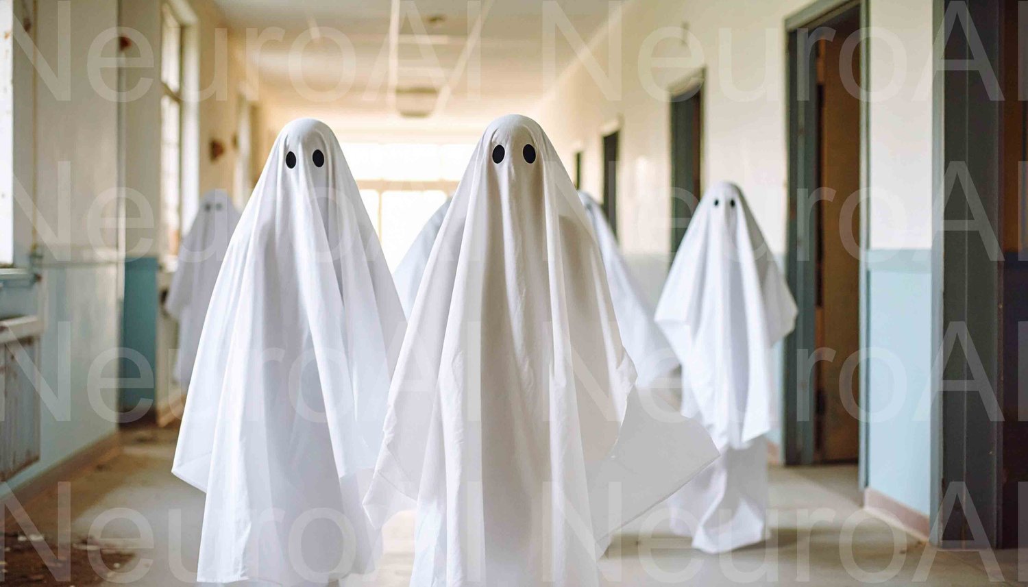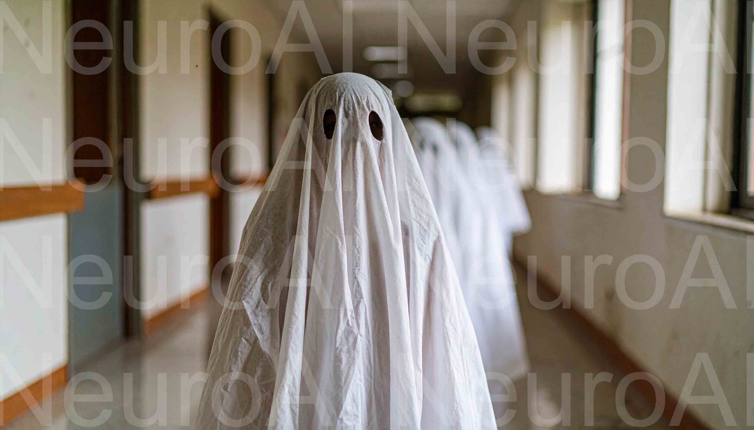 Spooky ghosts line up down a dimly lit, eerie hallway