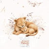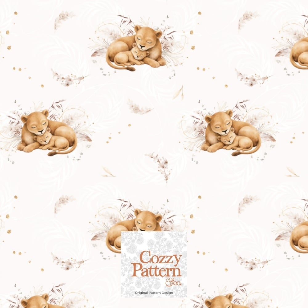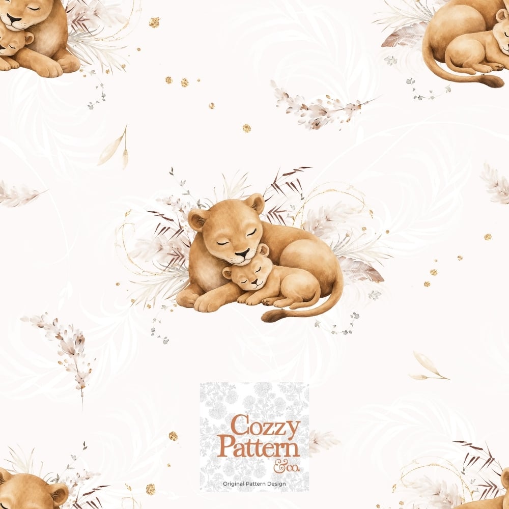 Create soft and heartwarming baby and nursery projects with this sleeping lion cub seamless pattern, featuring a gentle lioness cuddling her baby surrounded by delicate boho foliage and subtle botanical details.