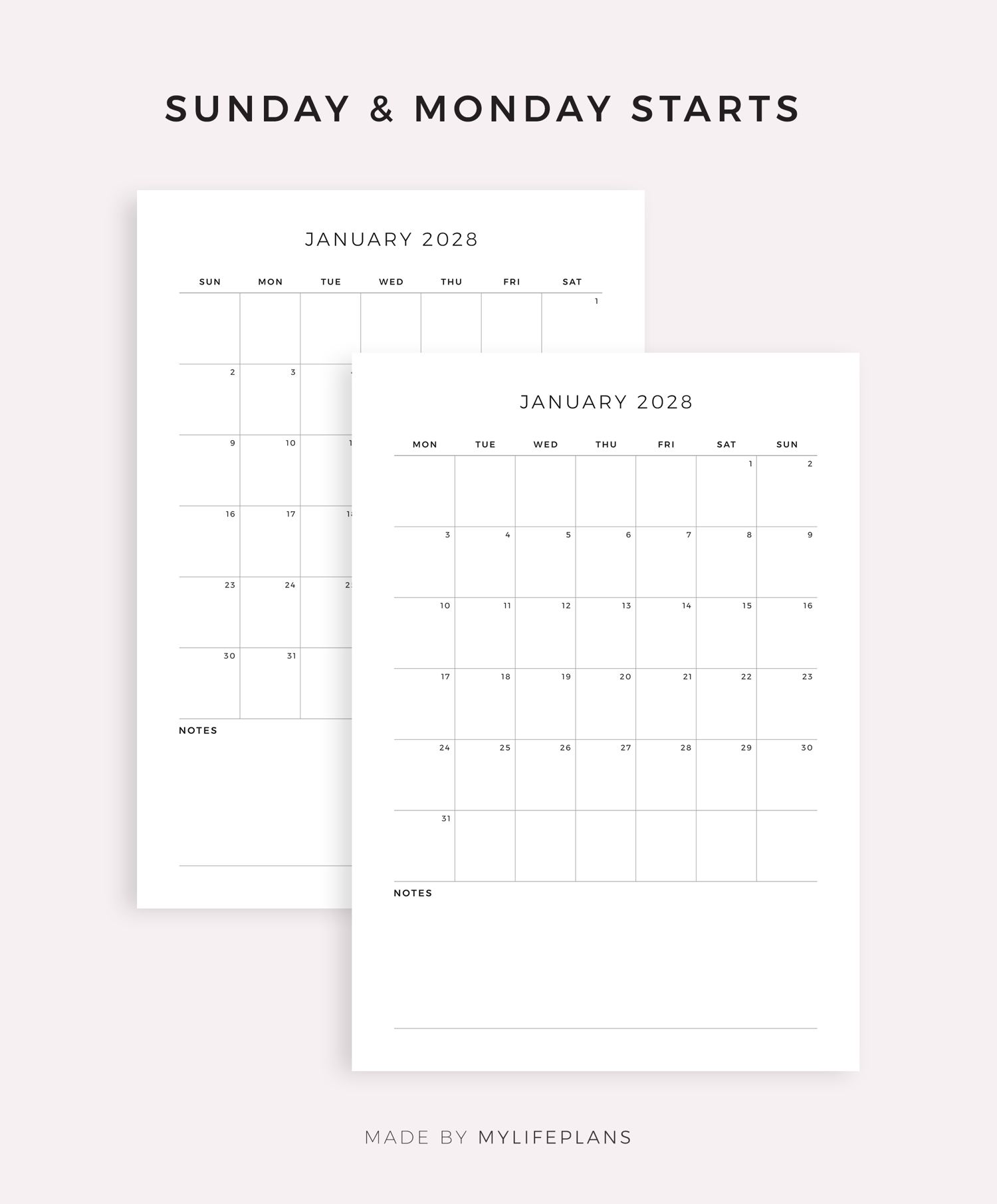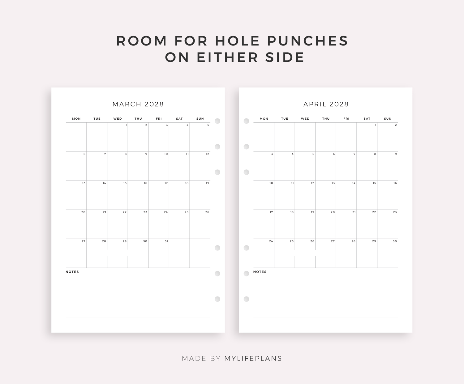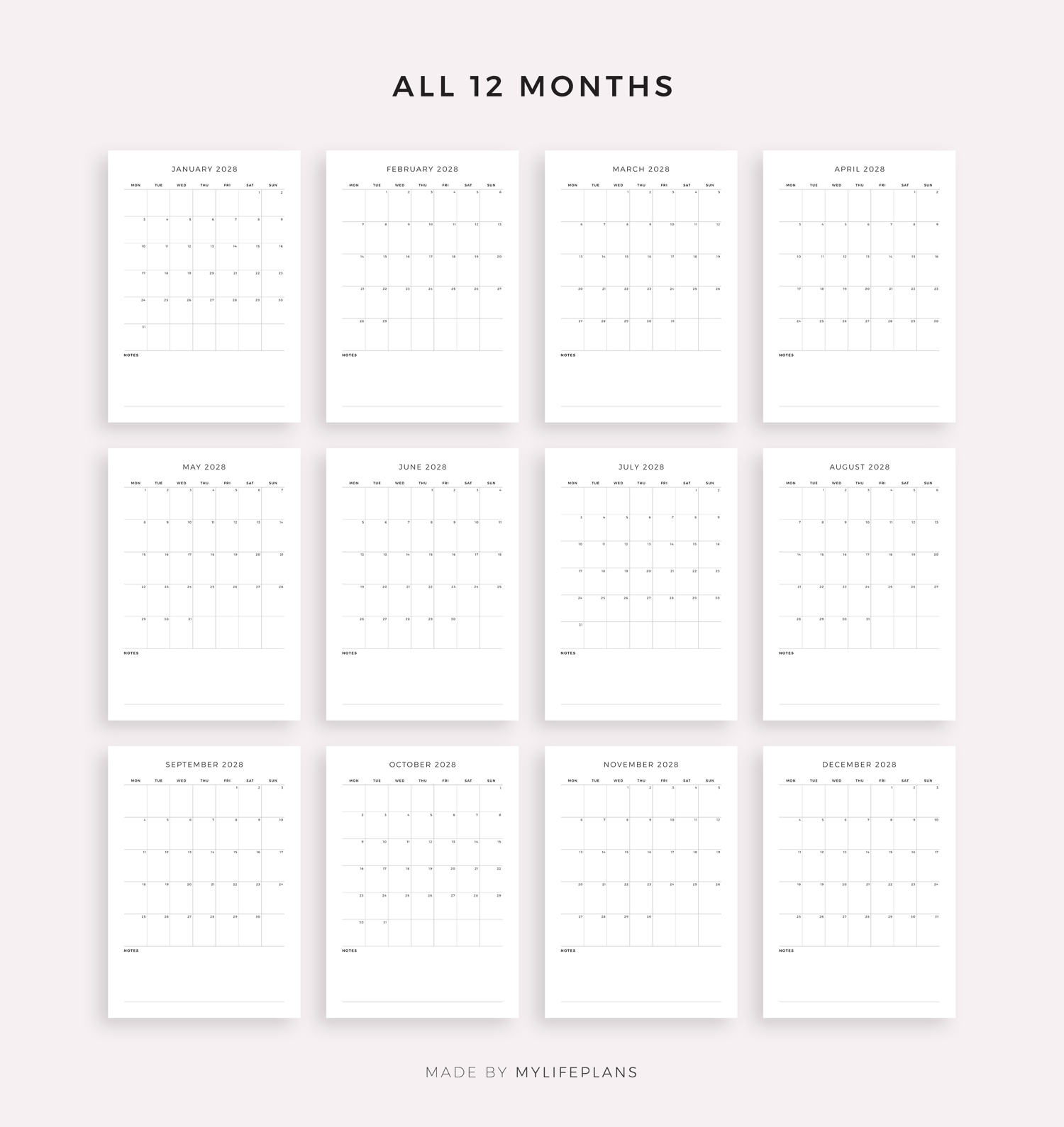2028 Monthly Calendar with Notes, Printable & Fillable, A4/Letter Size