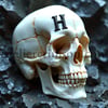 The letter H skull obsidian marble deeply engraved character on the forehead of a white marble skull. The character, filled with dark obsidian, contrasts sharply against the pale skull. Set against a black crystalline background, the skull and character dominate the image.