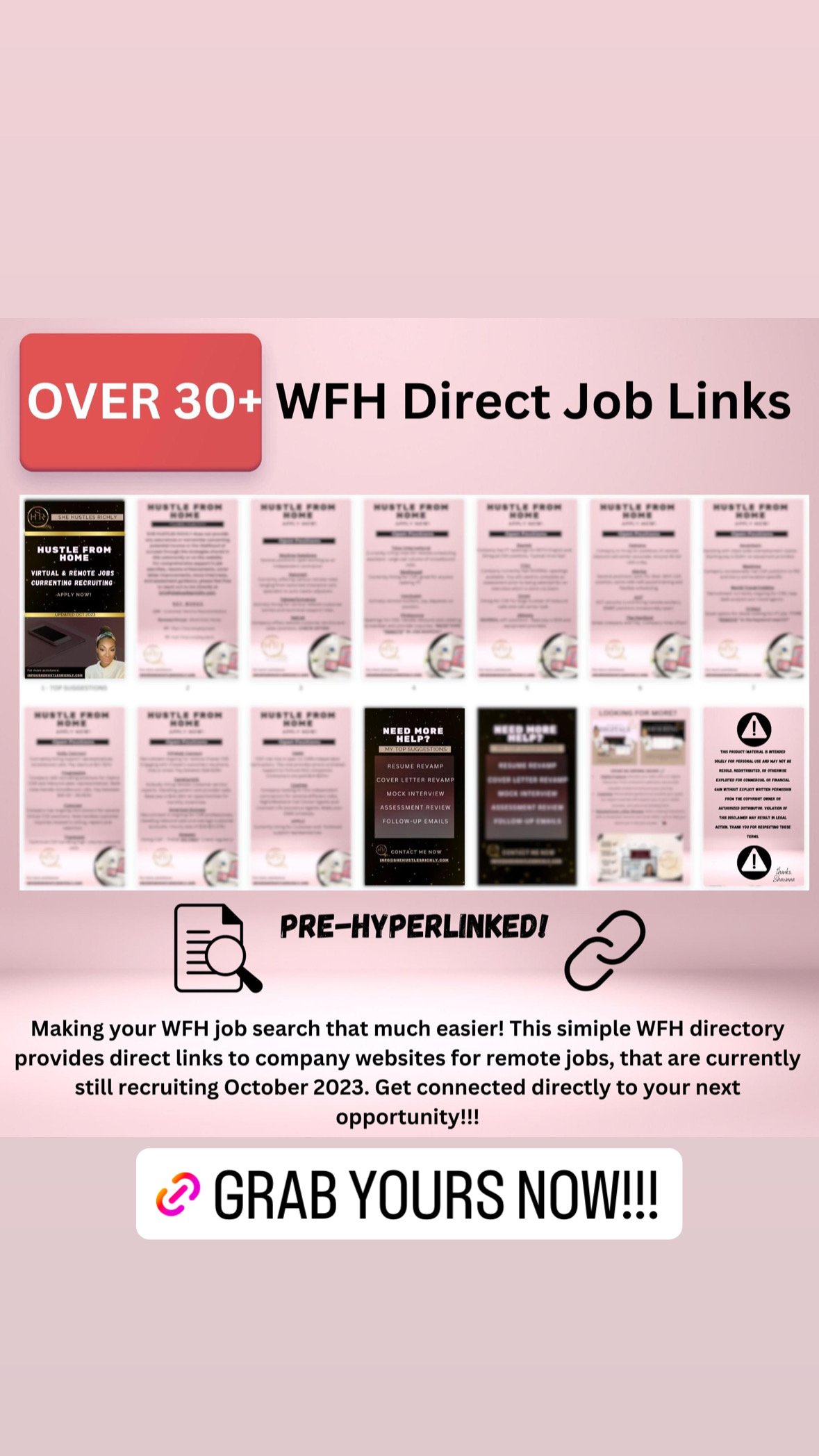 Introducing 'Hustle From Home – Done-For-You Remote Job Search Solution! Tired of the current stress and hassle of finding that perfect work-from-home job? We've got you covered. Our digital product includes 30+ searched WFH job opportunities from currently recruiting employers (updated Oct 2023). But here's the game-changer – every job listing is pre-hyperlinked, neatly organized in one document, and hyperlinked for your convenience, so you can seamlessly jump to the employer's site. Your dream remote job is just a click away!! This item is heavily discounted for a limited time!!! I've done the hard work, now get this and start applying!! *LIST NOT ELIGIBLE FOR PLR**