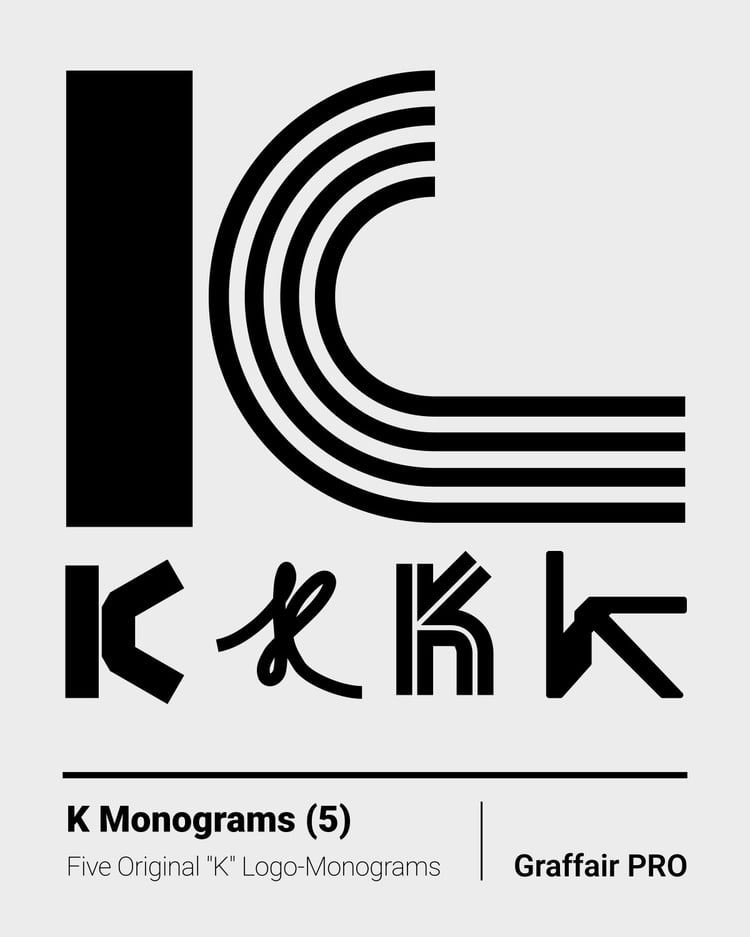 K Monograms (2): The 2nd set of five original "K" logo monograms, included in the "1050 SVG Monograms" super bundle, which also features an Index catalog.