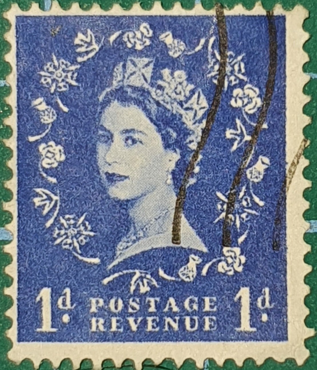 Esta ficha filatélica en formato PDF A4 (21,0 × 29,7 cm / 8,27 × 11,69 in) está dedicada al sello de Reino Unido emitido en 1955, valor 1d, perteneciente a la serie Wilding con el retrato de Elizabeth II.