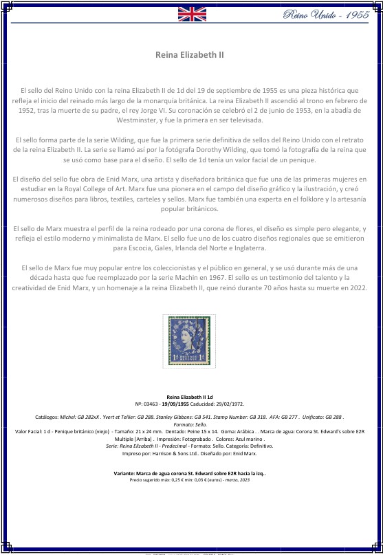Ficha filatélica PDF – Reino Unido 1955 · Elizabeth II 1d · Catálogo Sooluciones GB-1955-03463