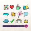 - A mix of vibrant icons, including stars, heart, arrow, coffee mug, book, speech bubble, sun, tick, cloud, crown, confetti popper, and rainbow
