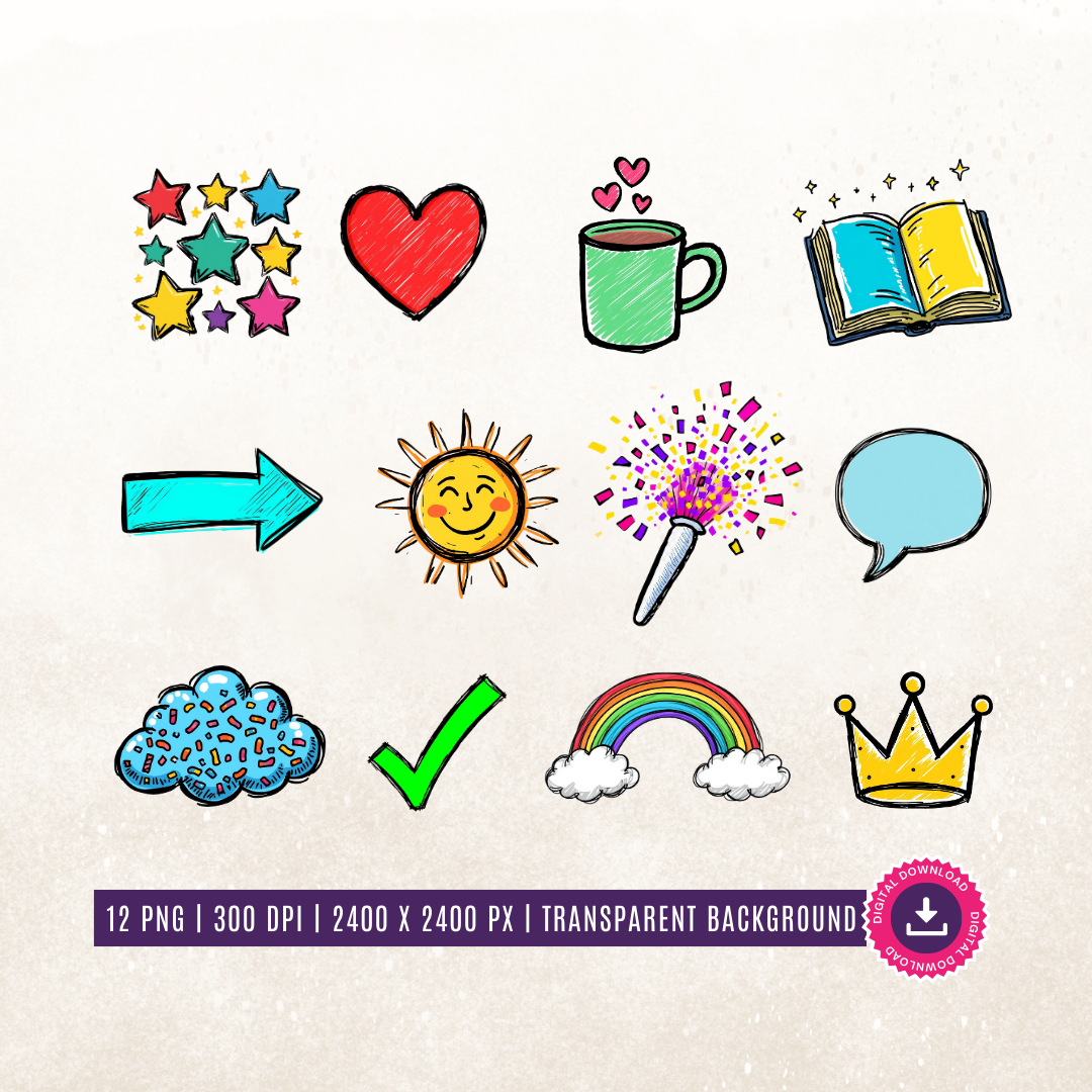 Add a pop of fun to your projects with this bright and playful doodle clipart set. Hand-drawn with a sketchy cartoon feel, these colourful designs are perfect for planners, journaling, scrapbooking, social media graphics, or any creative project that needs a cheerful boost.