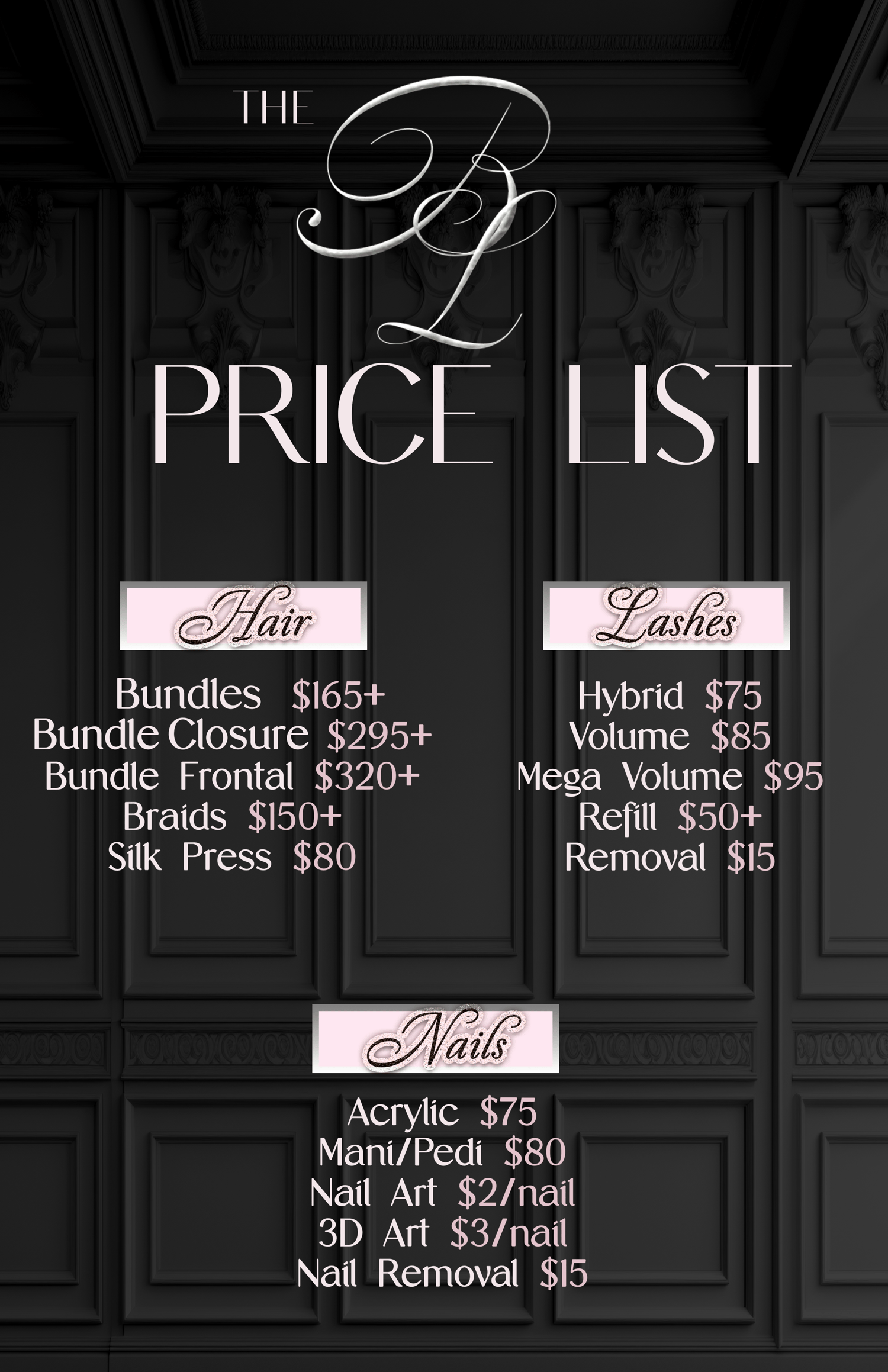 - Price List: A sleek, organized price list that makes it easy for customers to see your offerings at a glance.