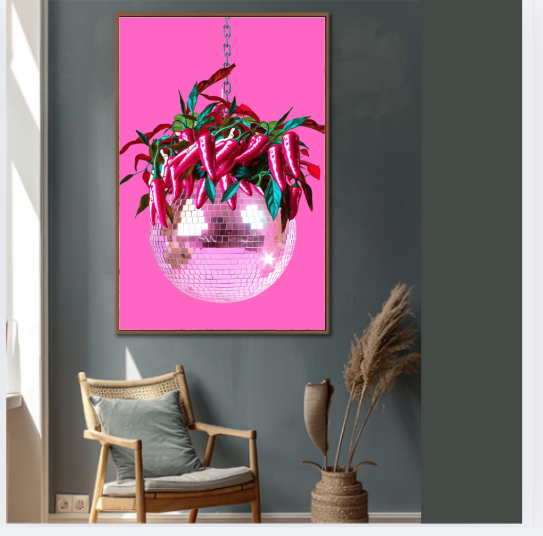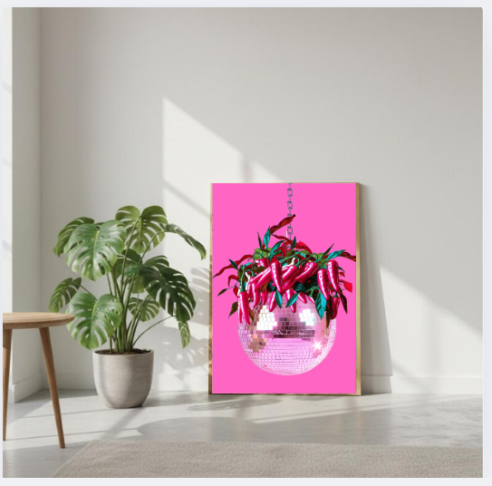 Introducing the Disco Ball & Chili Pepper Print, a vibrant piece of digital wall art that brings the groove of the dance floor into your space. This striking design features a dazzling disco ball paired with fiery red chili peppers, creating an electrifying contrast that captures attention instantly. Imagine the exhilarating energy of a night out, distilled into a captivating print that feels like a party on your wall. Perfect for adding a touch of retro flair or a splash of vibrant color to any room, this digital wall art blends the playful sparkle of disco with the sizzling charisma of chili peppers. With its dynamic imagery and bold colors, this print transforms any room into a lively hub of creativity and style. Embrace the fusion of fun and fiery elegance with this unique Disco Ball & Chili Pepper Print—innate charm that's sure to make a statement. Whether it's for a trendy living room, a stylish office, or a fun-loving kitchen, this print invites excitement and conversation wherever it hangs.