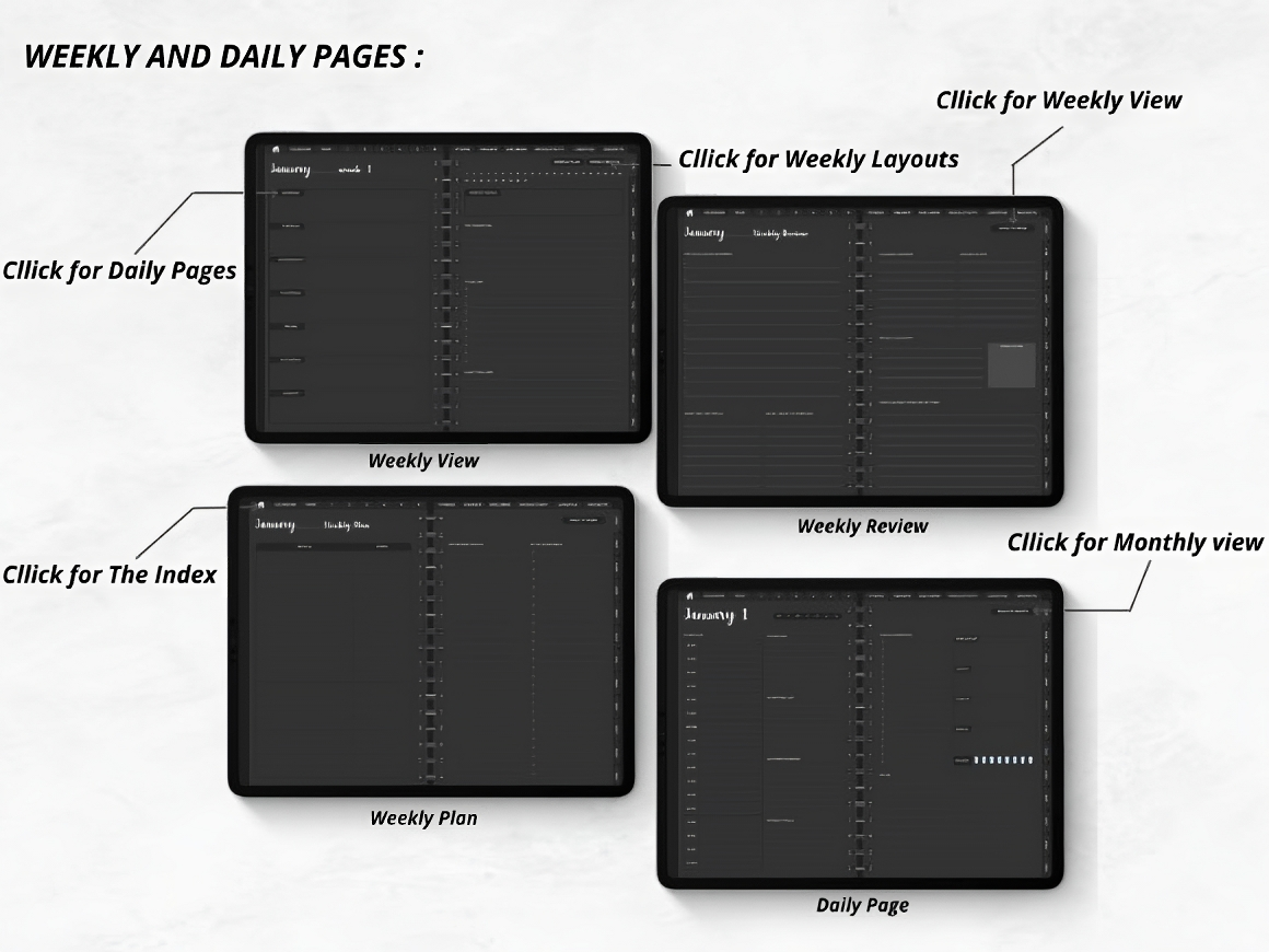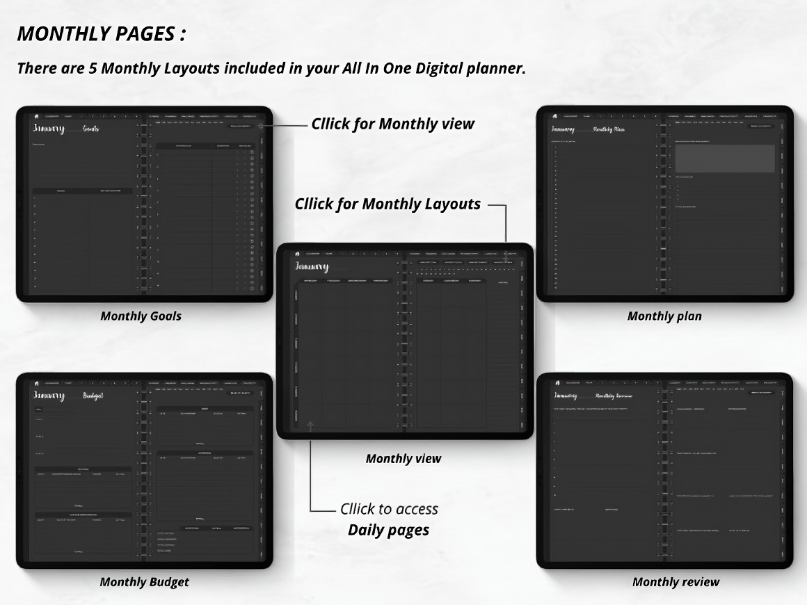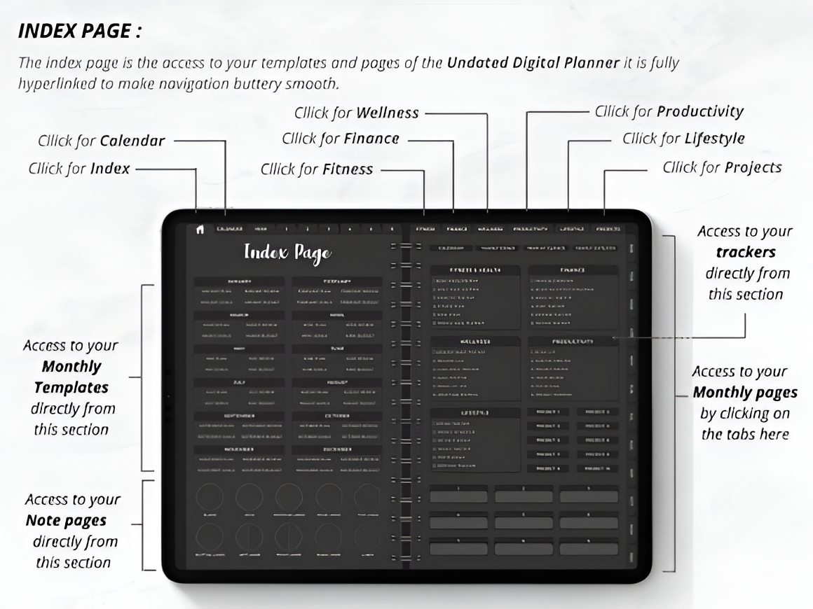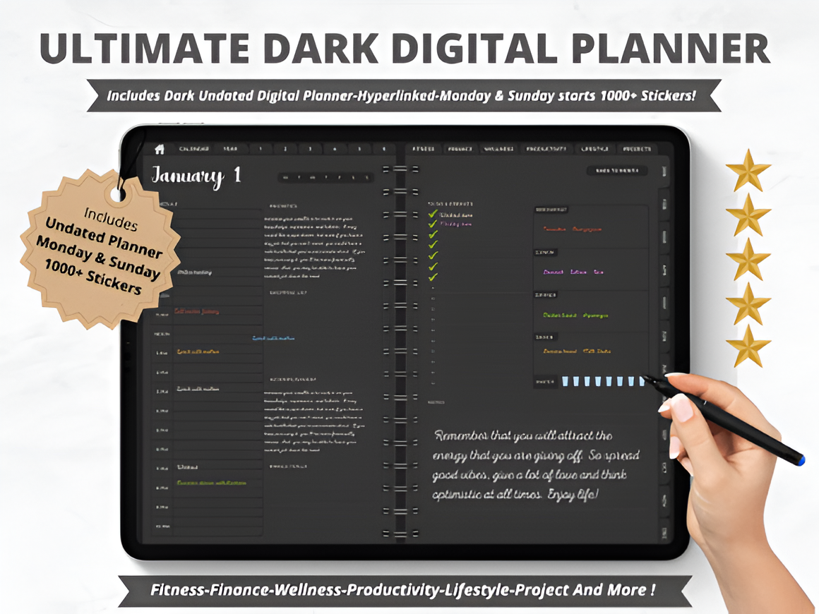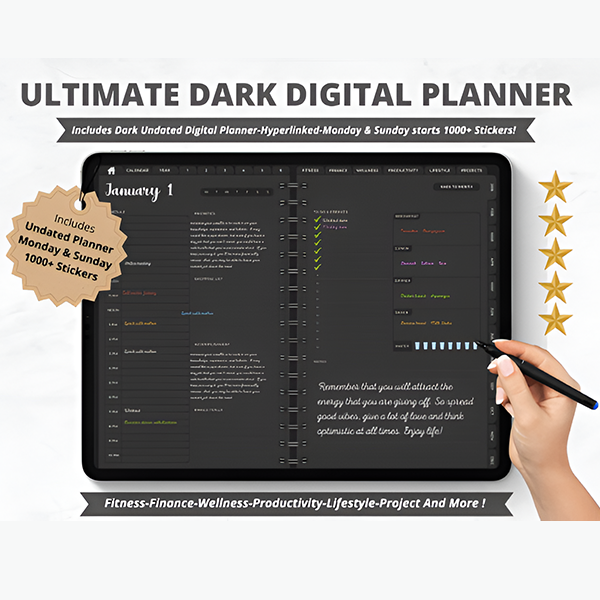 The Ultimate Dark Undated Digital Planner is the best Digital Planner to organize your life and achieve your goals, with a creative design, fully hyperlinked for effortless navigation, and several lifestyle planning pages, this planner is the ultimate productivity tool. This listing includes 2 Undated Digital planners Monday and Sunday starts + 1000 stickers, designed to be accessible and useful for wide range of people.