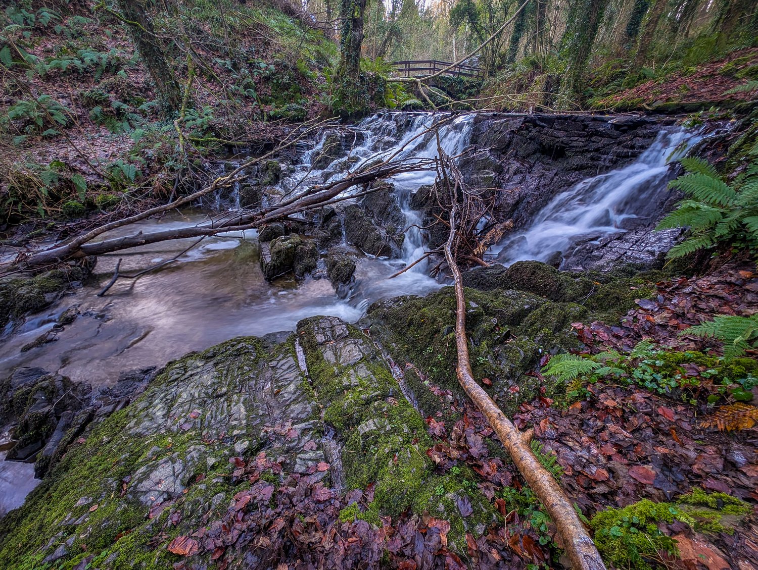 Water flows gently over moss-covered rock in the shaded woodland of Dún a Rí Forest Park. A tranquil forest scene that highlights the quiet detail and natural rhythm of the landscape.