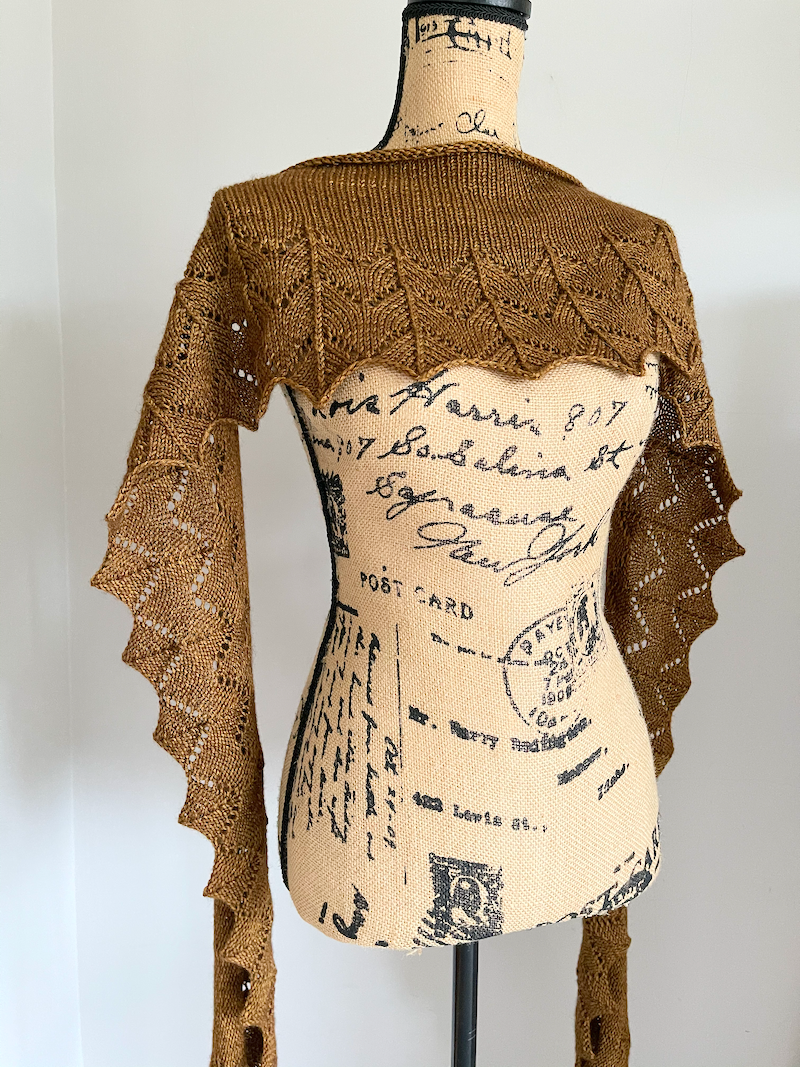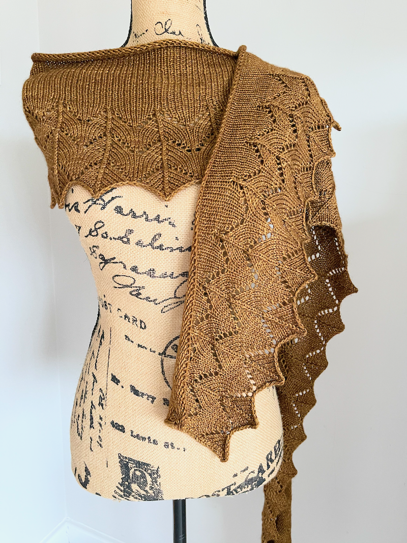 The shawl is cast-on on the long edge of the shawl, a section of lace is knit (chart and written instructions provided). The top is then shaped using wrap and turn short rows (other short row methods can be substituted).