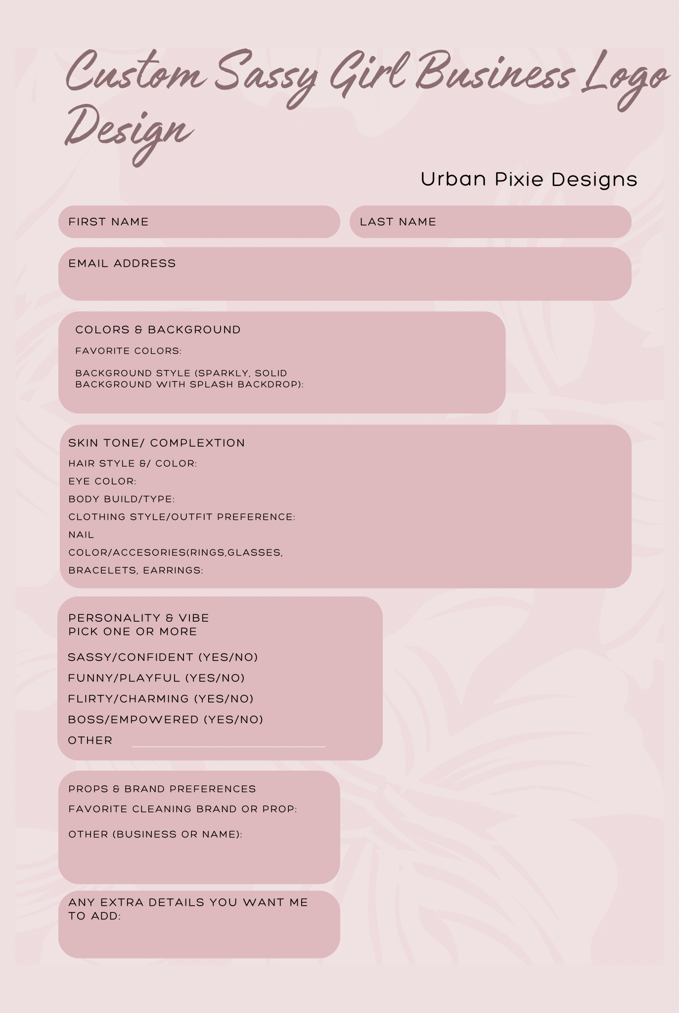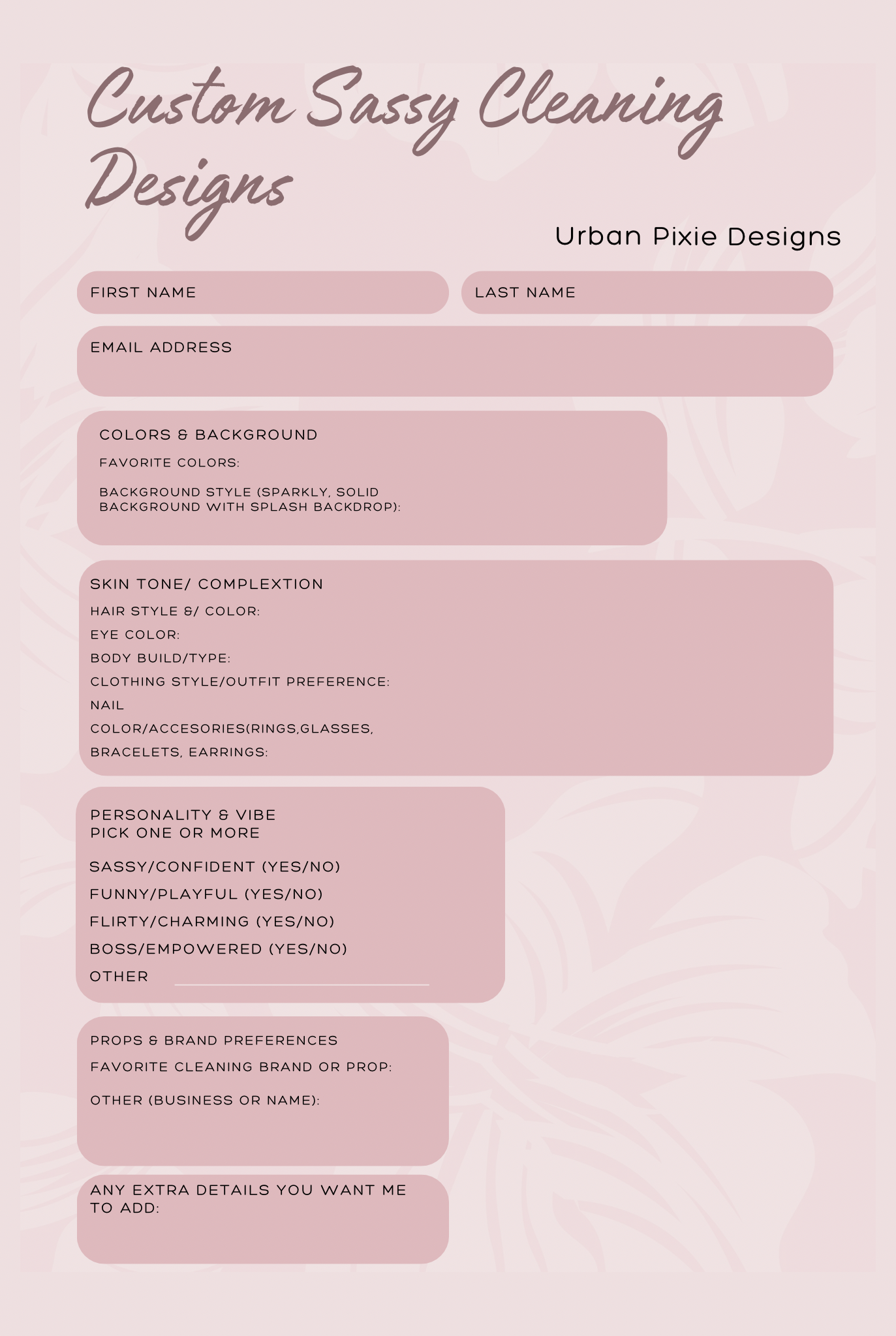 - Fill out the order form inside the PDF with your details: skin tone, hair, outfit, quote, props, etc.