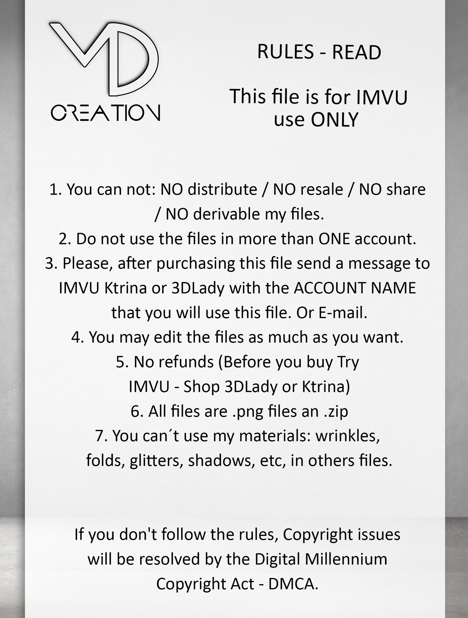3. Please, after purchasing this file send a message to IMVU Ktrina or 3DLady with the ACCOUNT NAME that you will use this file. Or E-mail.