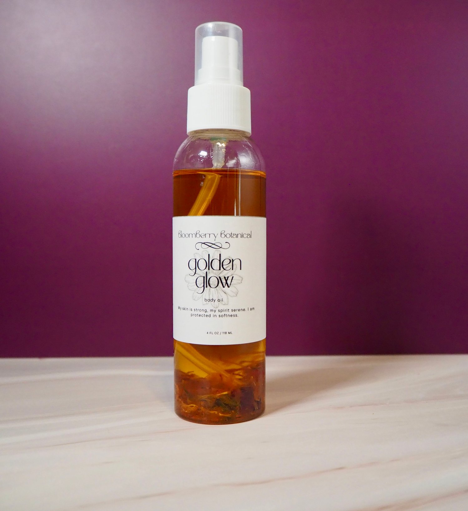 GoldenGlow captures the warmth of sunlight in a bottle — a calendula-infused elixir that softens, restores, and brightens dull skin. With every drop, this golden oil melts into the skin to promote elasticity and radiance, leaving a silky, sun-kissed finish that glows from within.