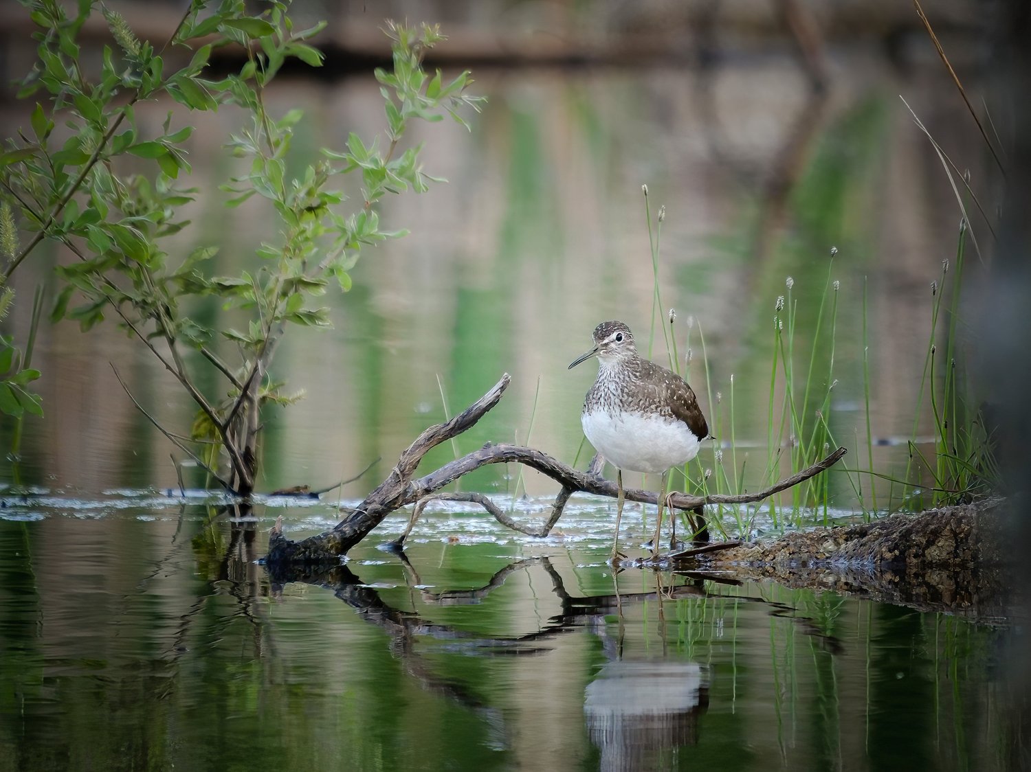 Green Sandpiper (Tringa ochropus) looking for food in a pond.