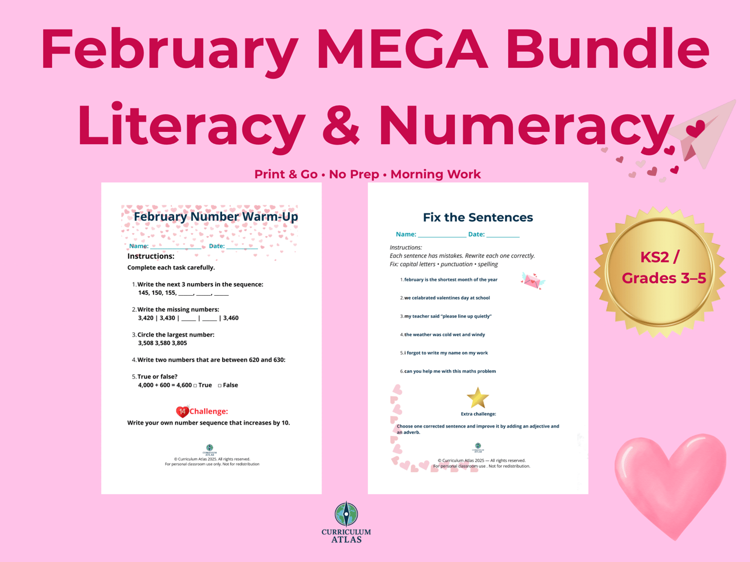 This February MEGA Bundle includes a wide range of no-prep literacy and numeracy worksheets designed for KS2 / Grades 3–5 learners.