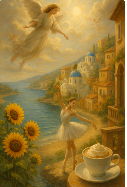 The example shown here is titled “My Favourite Things”, created to bring together my personal loves: angels, sunflowers, Italy, Santorini, ballet, the beach, lakes, and a perfect café latte.