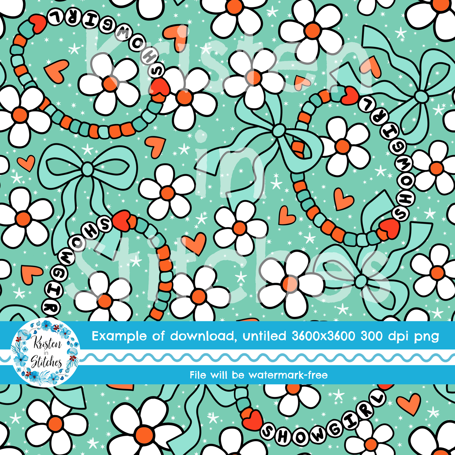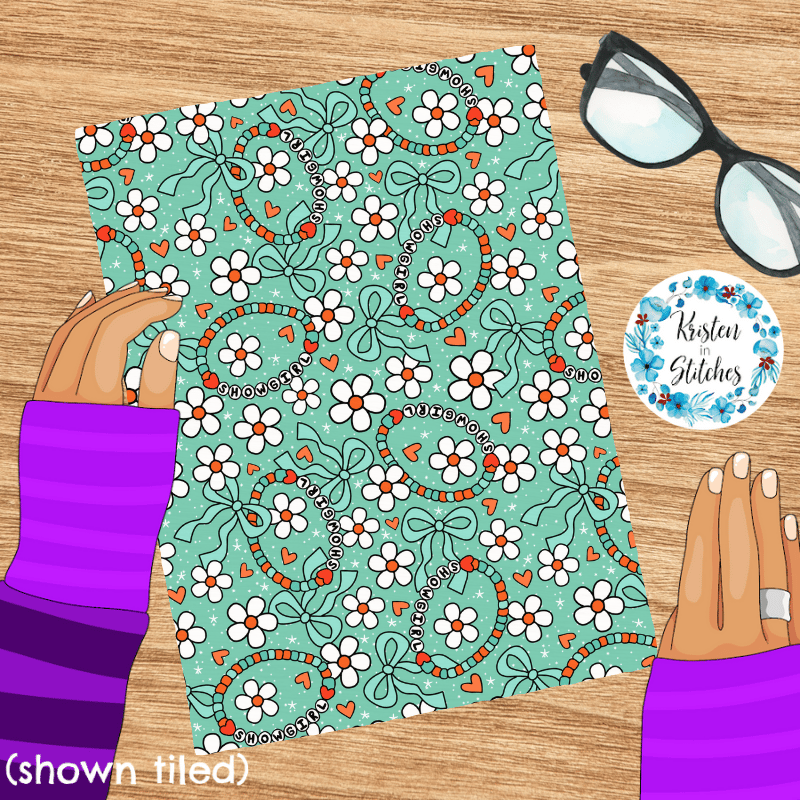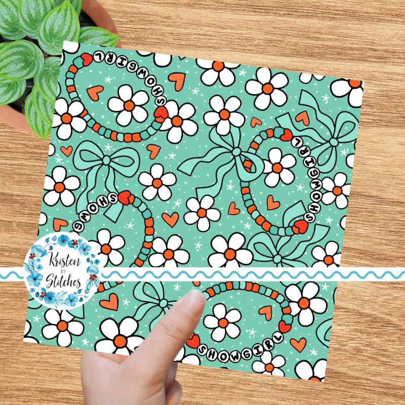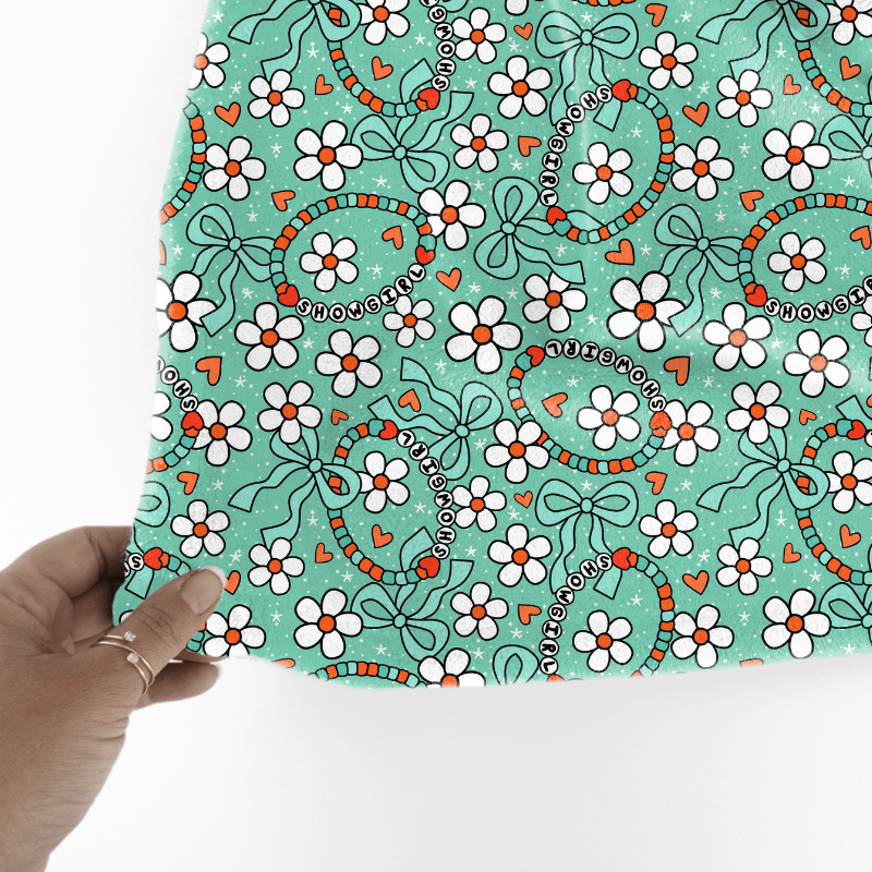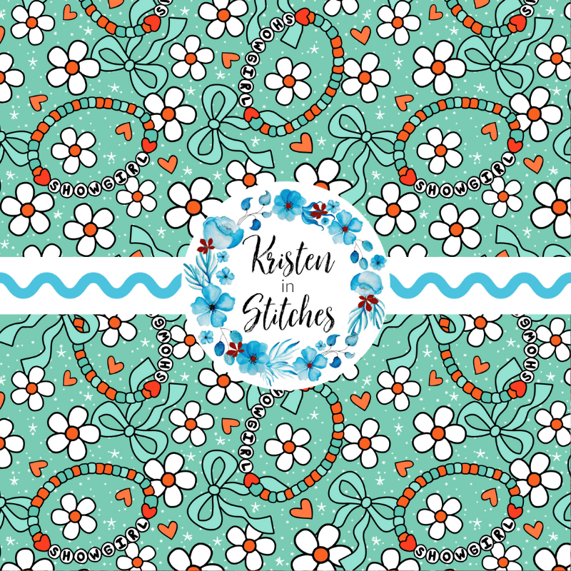 Life of a Showgirl friendship bracelets, with daisy flowers, hearts and coquette ribbon bows on mint.