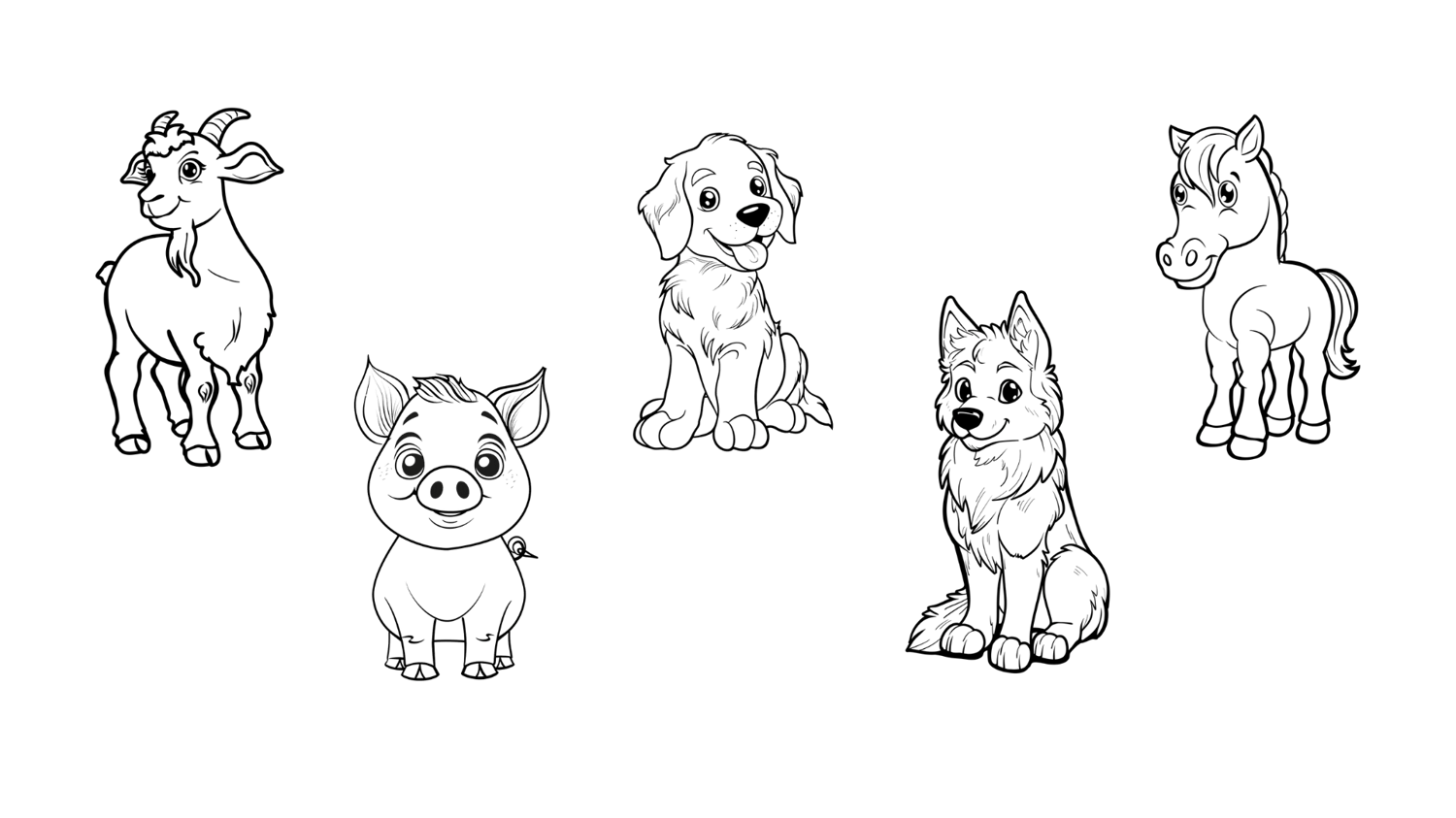 Cute Animals Coloring- Dog, Wolf, Pig, Horse, Goat