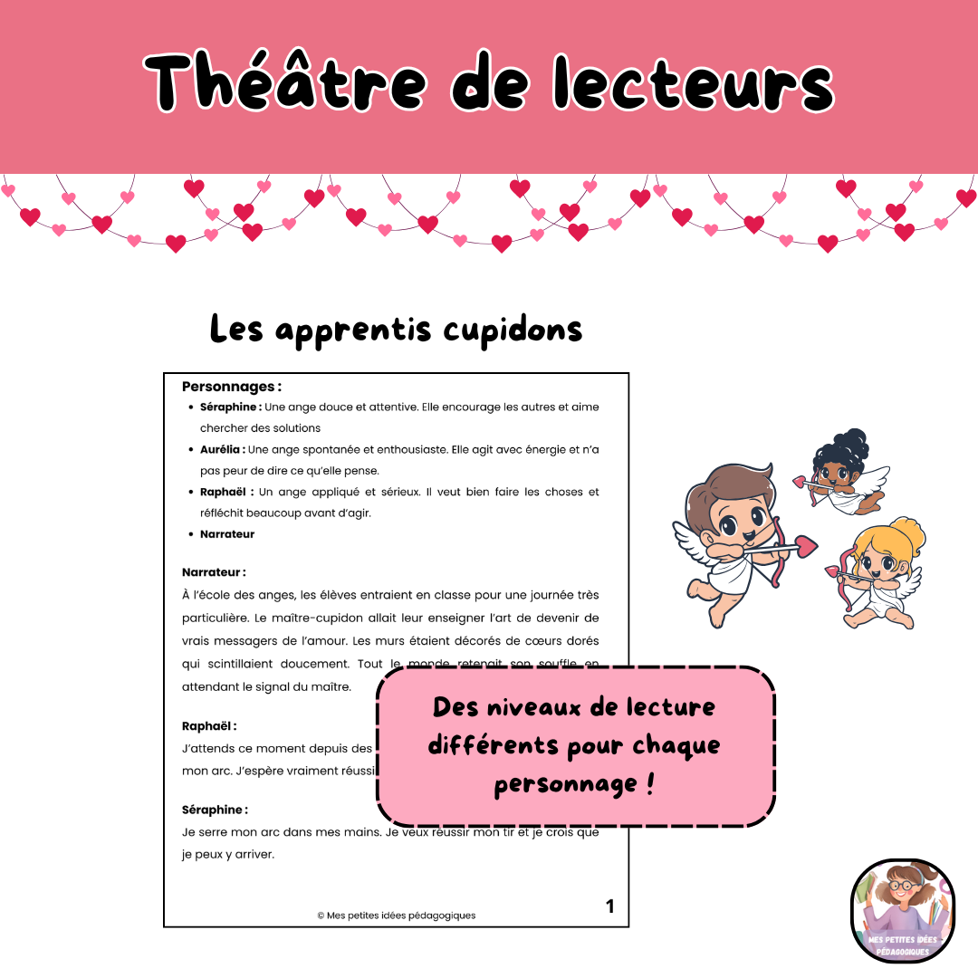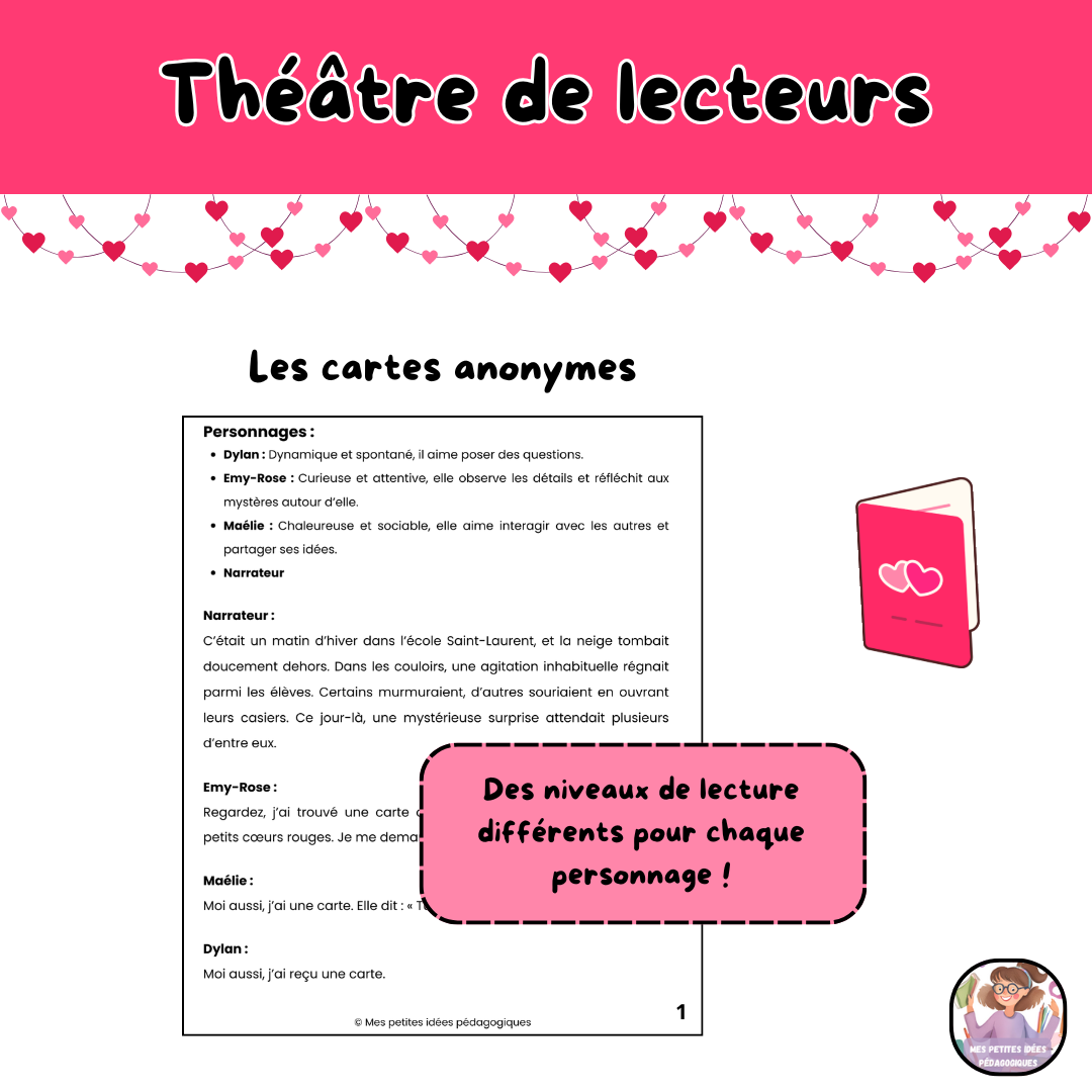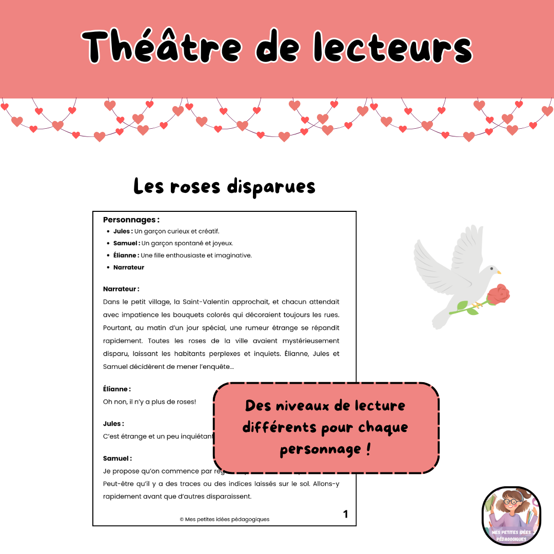 Ces théâtres de lecteurs permettent aux élèves de 2e cycle de participer activement à la lecture, en alternant les rôles entre les personnages. C’est un contexte concret et ludique pour travailler la fluidité en lecture. Les documents peuvent être utilisés avec des élèves de niveaux scolaires variés selon leur habileté en lecture et en fonction de l’intention pédagogique recherchée. Ce matériel peut donc être utilisé dans divers contextes (classe, orthopédagogie). Vous trouverez 6 histoires sous le thème la Saint-Valentin comprenant chacune trois personnages ainsi qu’un narrateur.