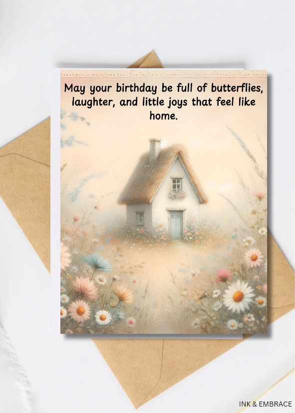 Cozy Cottage Birthday Card | 'Butterflies, Laughter & Home' Heartfelt Greeting