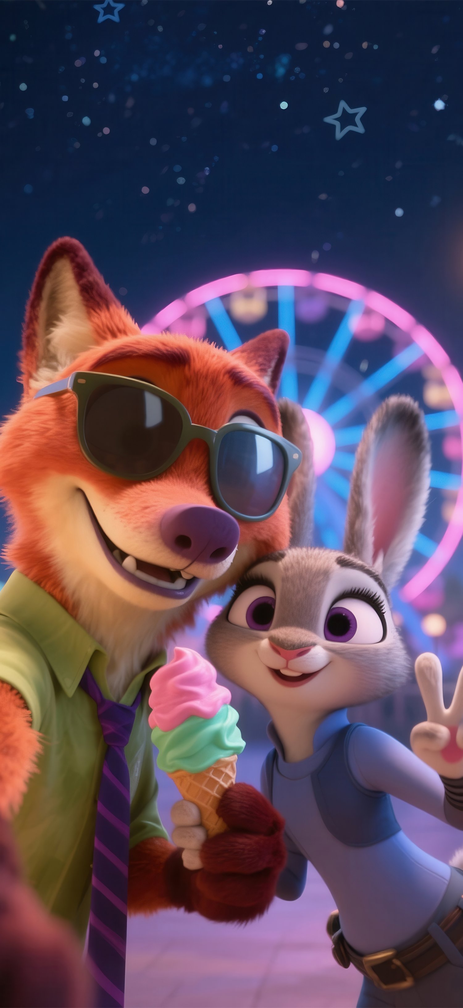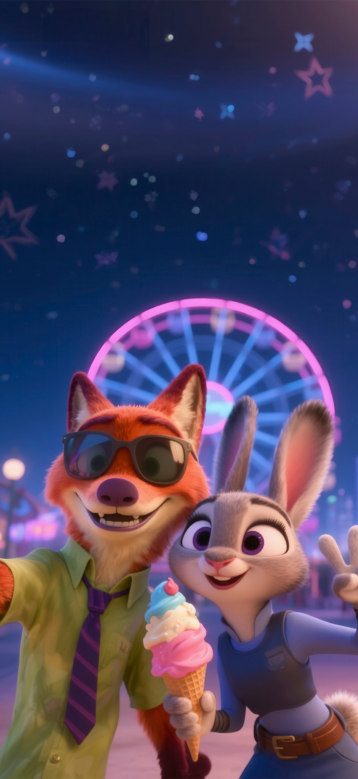 This set includes a stunning dynamic wallpaper where Judy and Nick are captured taking a selfie in front of a beautifully lit Ferris wheel at a carnival, with a starry night sky above. The dynamic wallpaper is optimized for both Android and iOS devices, allowing you to enjoy this animated scene on your smartphone or tablet.
