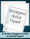 Includes: Informational article about the animal (1 page), Research organizer to record information (1 page), report cover page, blank page with border (for drawing a picture of the animal and habitat), writing pages with borders & primary lines (2 pages), and writing pages with borders & standard lines (2 pages).