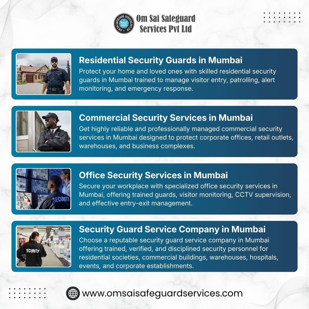Choose a reputable security guard service company in Mumbai offering trained, verified, and disciplined security personnel for residential societies, commercial buildings, warehouses, hospitals, events, and corporate establishments. Our guards provide proactive patrolling, incident reporting, emergency support, and professional conduct at all times. Enhance the safety of your property with dedicated manpower and efficient security protocols tailored to your needs. Experience dependable and high-standard protection with Om Sai Safeguard Services Pvt Ltd.