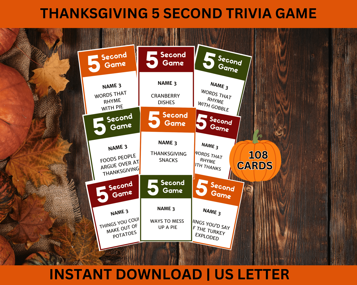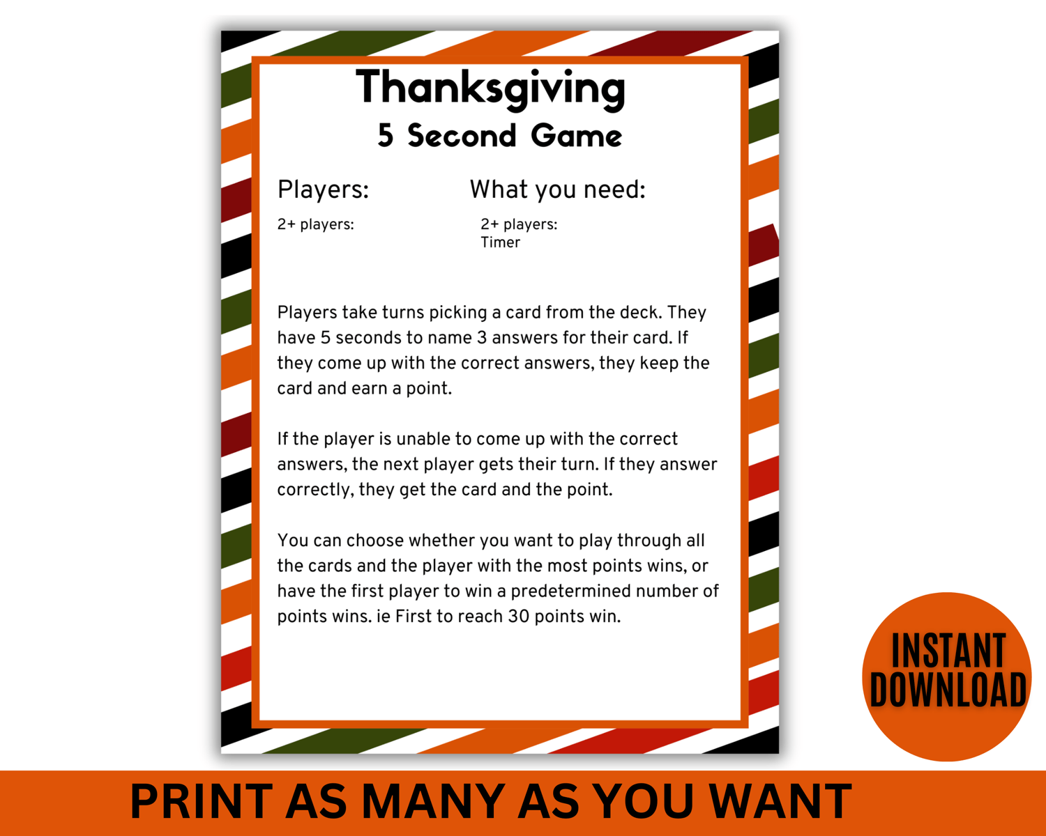 Get ready for fast-paced laughs this Thanksgiving with our Thanksgiving 5 Second Game! This printable party game comes with 108 pre-filled cards bursting with a mix of classic and quirky Thanksgiving-themed “Name 3” questions — plus a blank template so you can add your own hilarious twists.
