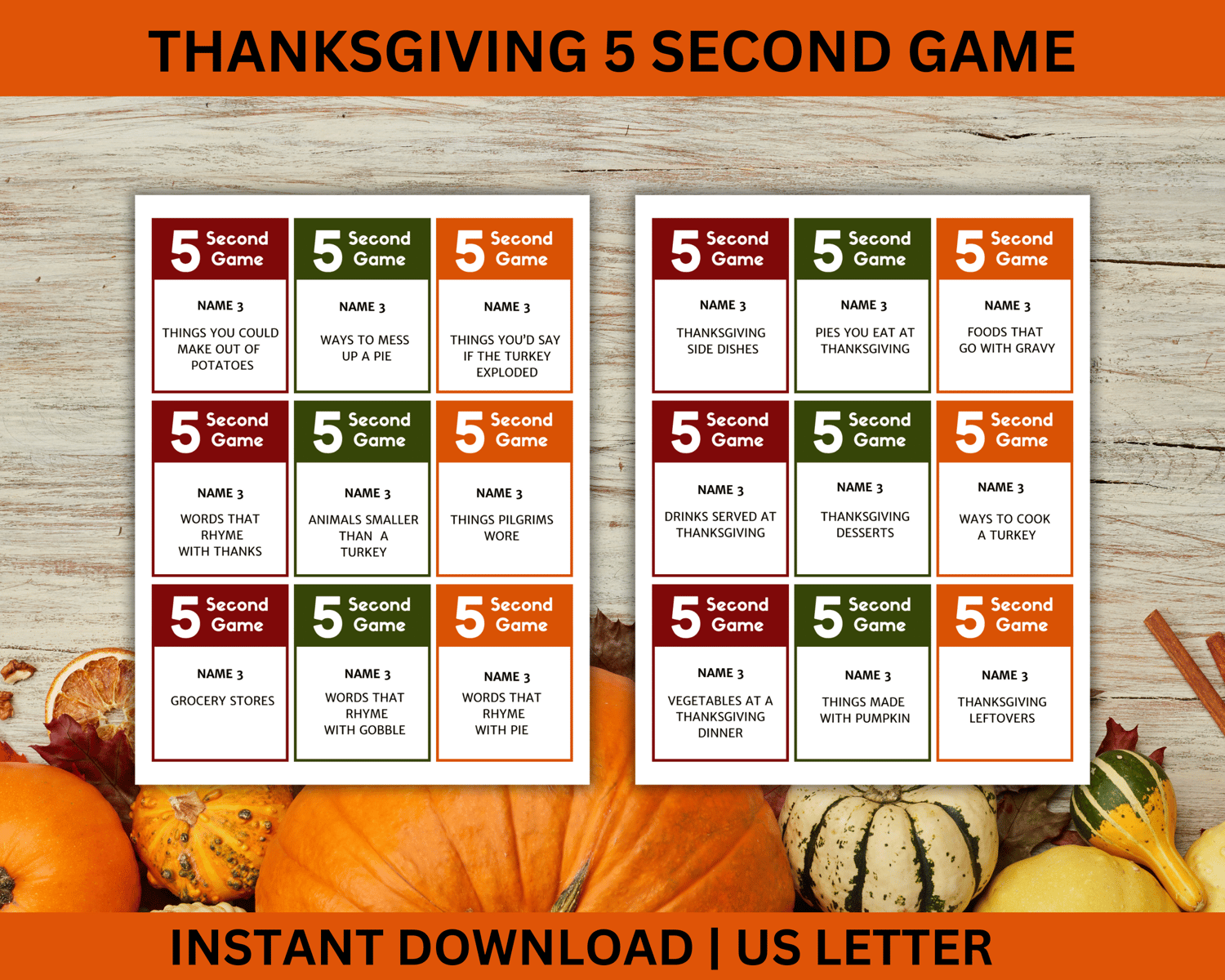 Thanksgiving 5 Second Game, Fun Printable Party Activity for all Ages