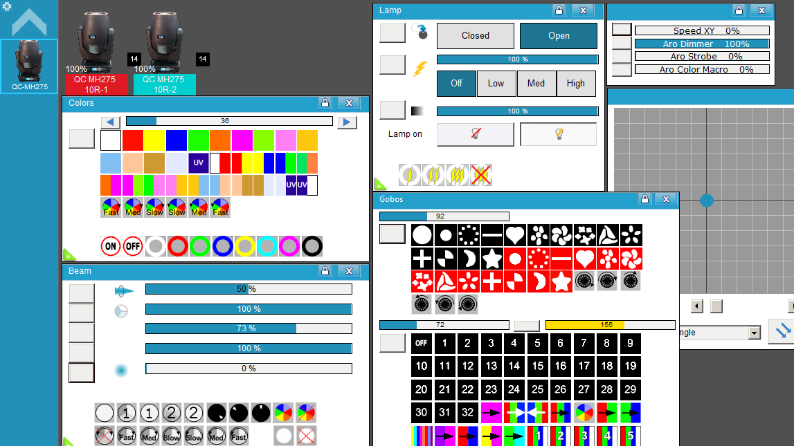 * Verifique, con el Fixture de pruebas de 30CH (click), que coincidan estos canales: 3 Dimmer, 2 Strobo/Shutter, 1 en el valor 36 = Color Verde, 4 en el valor 92 = Gobo de Estrella, 9 foco (ver tercer foto).