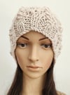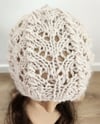 This quick knit chunky Beanie has a 2x2 rib brim then is worked in a lovely lace stitch.