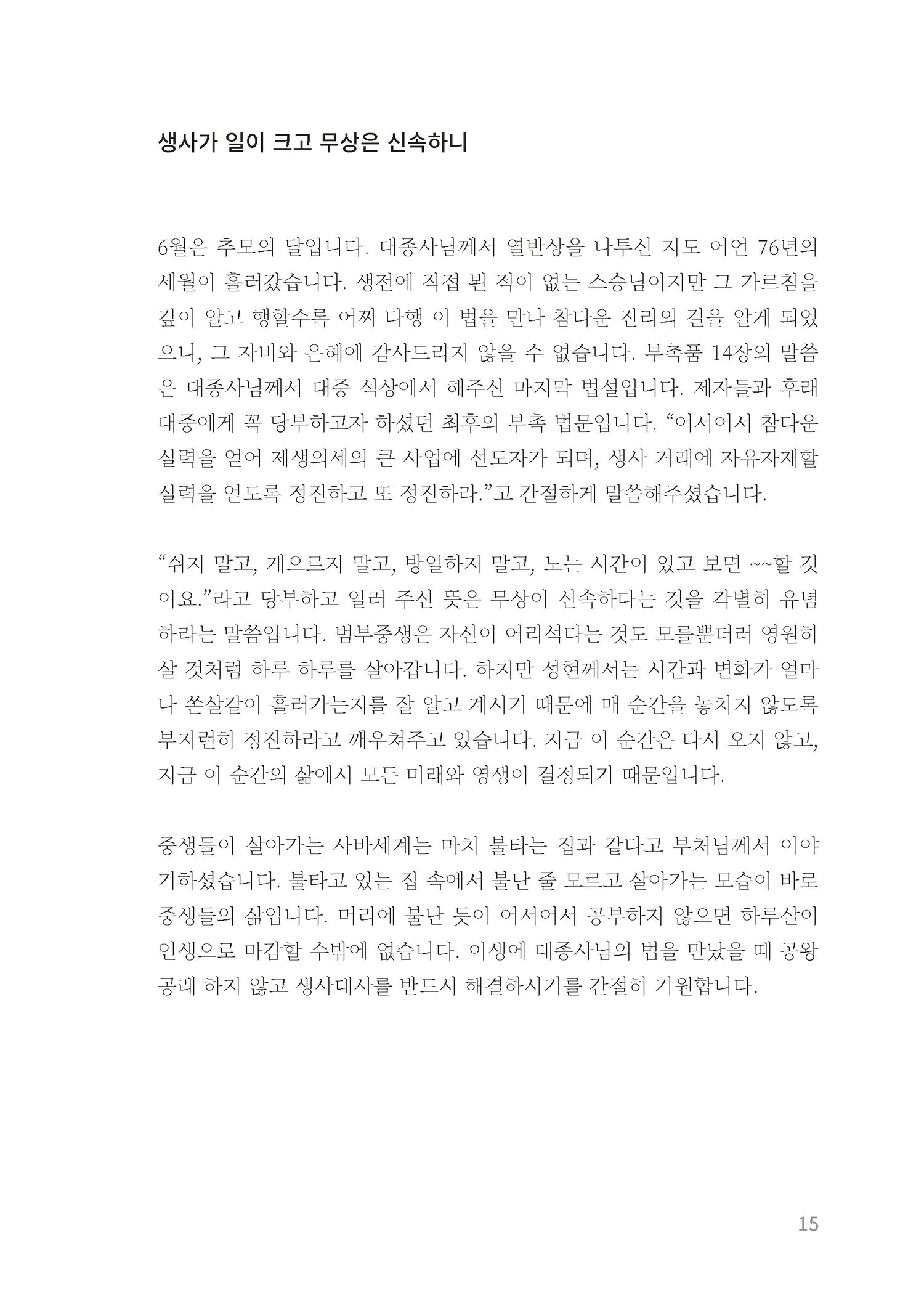 니다. 대추 한 알도 태풍 천둥과 서리와 땡볕 초승달이 들어서서 만들어지듯이 이 세상 만물과 만사는 어느 것 하나 당연한 것은 없습니다. 나로부터 연결된 관계를 하나하나 짚어보면 전 우주와 연결되어 있다는 것이 금방 드러납니다. 모든 만물이 천지를 벗어나 이루어진 것이 없고 각자의 유전인자를 물려받은 앞세대가 없을 수 없으며, 더불어 살아가는 무리와 그 무리의 질서가 없이는 우리는 단 한 순간도 살아갈 수 없습니다. 그러므로 나라는 존재는 독립된 개체가 아니라 나 아닌 모든 것들의 총합이라고 해야 합니다. (저자)