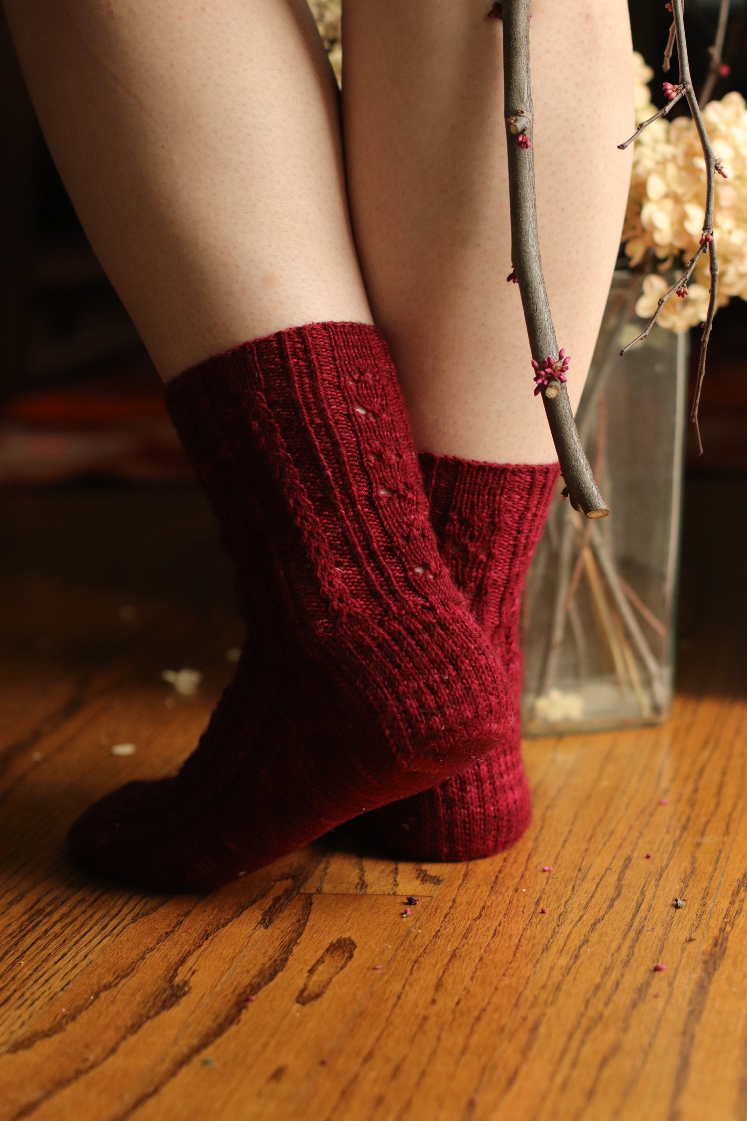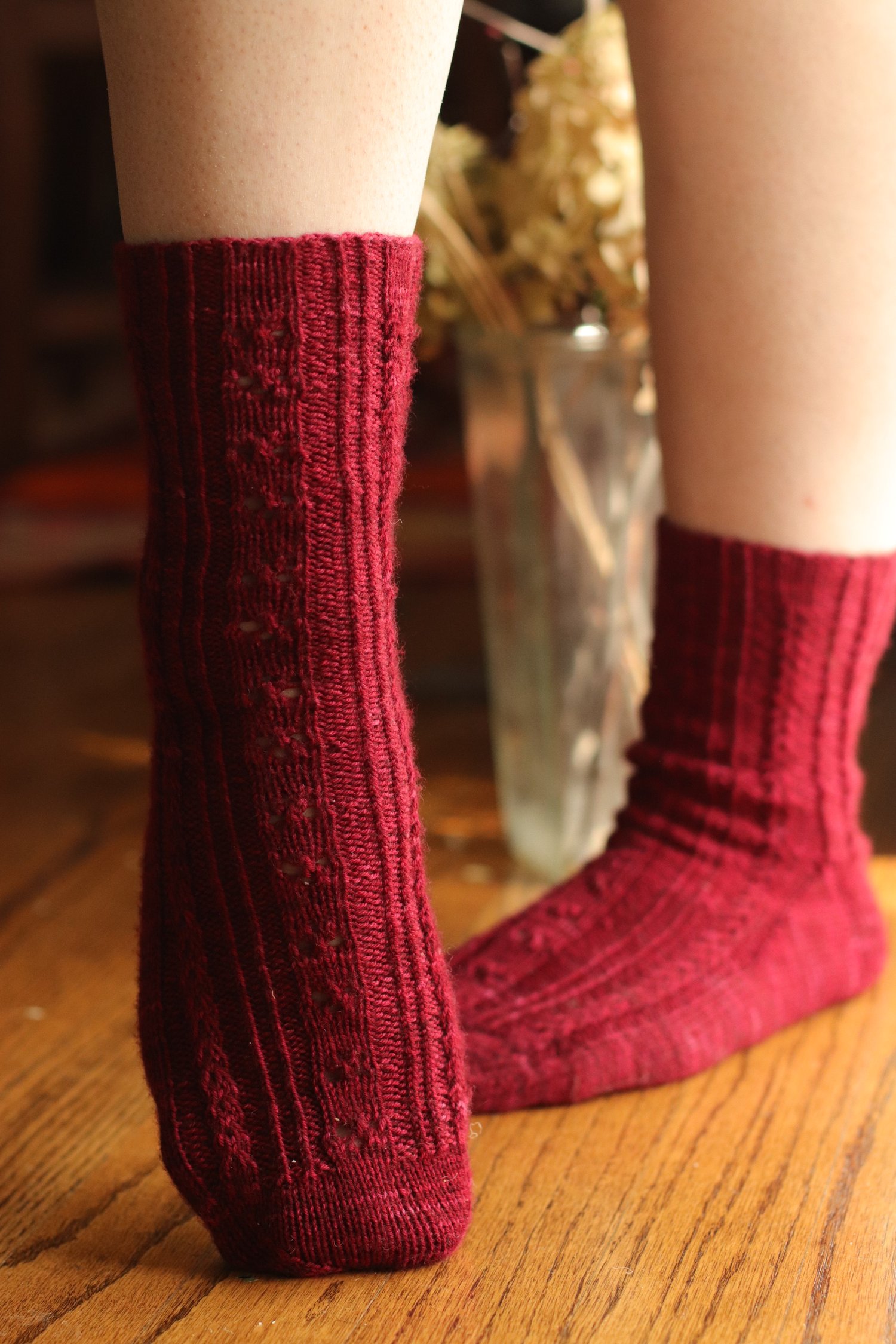 Alizarin Socks are a sweet, pointelle inspired knit with two options at the center of the sock. Choose from pretty eyelets to lean into a delicate aesthetic or a work a clean and minimal stockinette rib. These socks are knit from the cuff down with a traditional heel flap and gusset in fingering weight yarn. There are four sizes, and the rib-based pattern is quite stretchy and allows for a contoured feel.