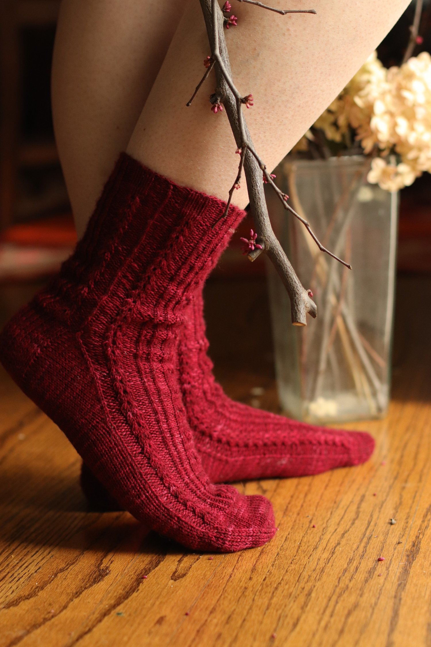 This pattern assumes knowledge of working in the round and basic sock construction. There are two stitch pattern options; both are provided in charted and fully written format. Video tutorial is provided for the faux 1x1 cable twists.