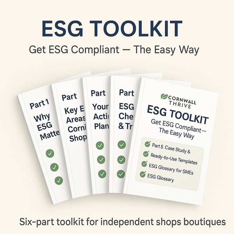 This practical, Cornwall-focused ESG guide is built for independent shops, cafés, and local businesses who want to embrace sustainability — without hiring consultants or wading through corporate jargon.