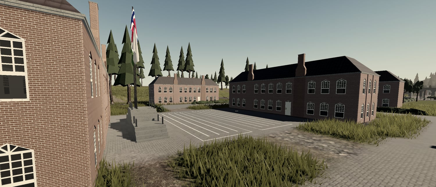 • Highly detailed main base with realistic brick buildings, flags, and central courtyards for formation or parade events.