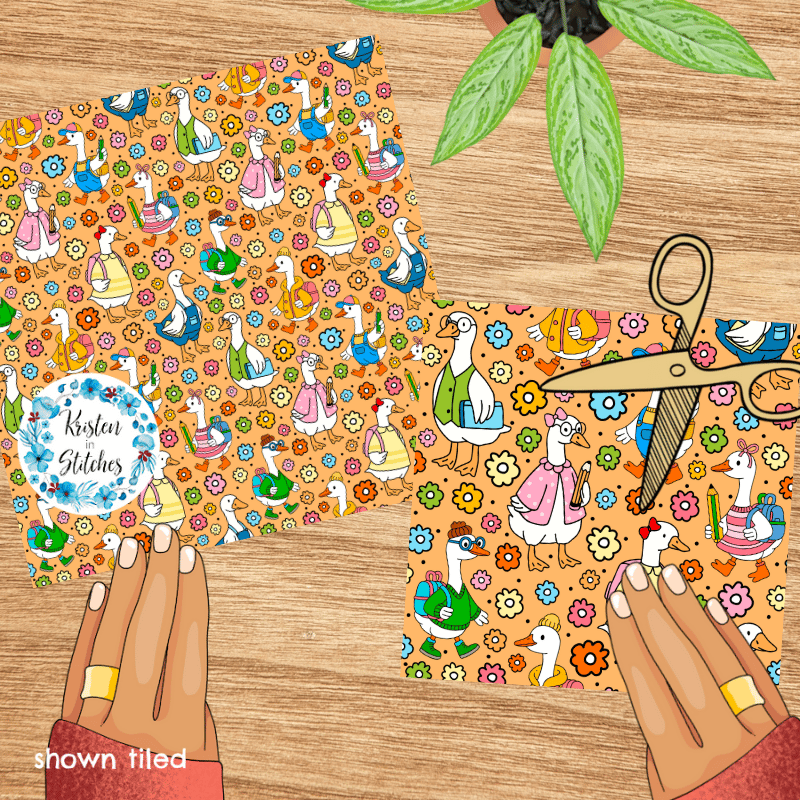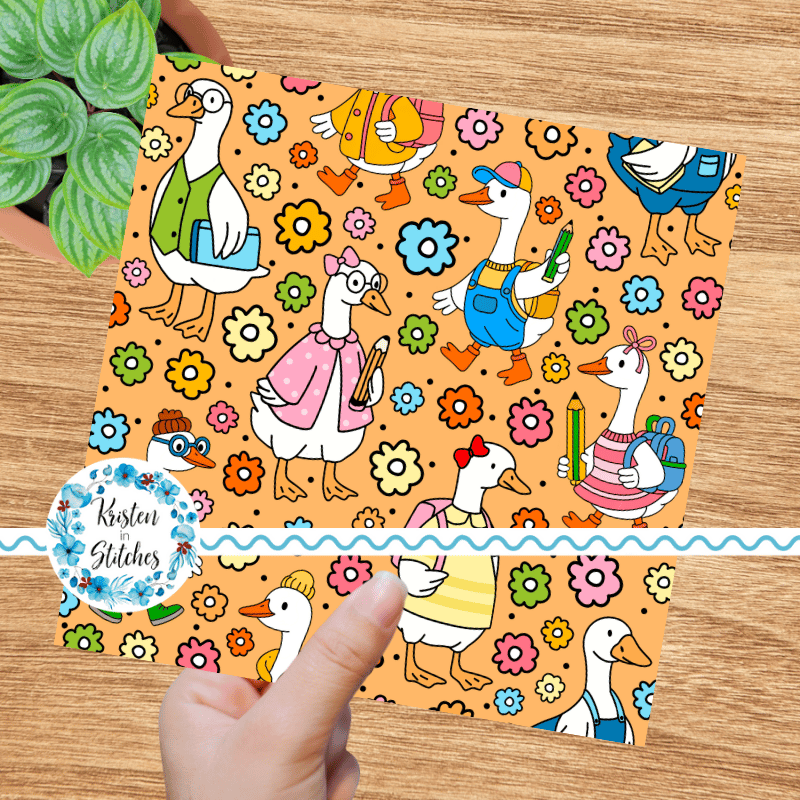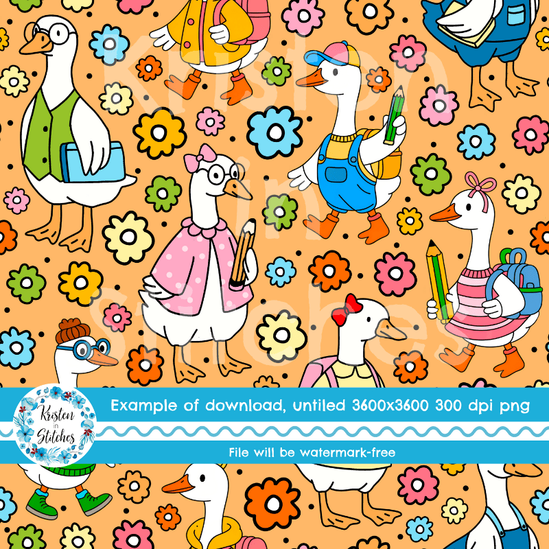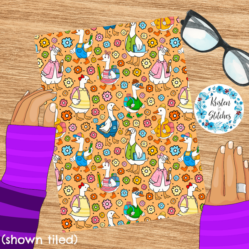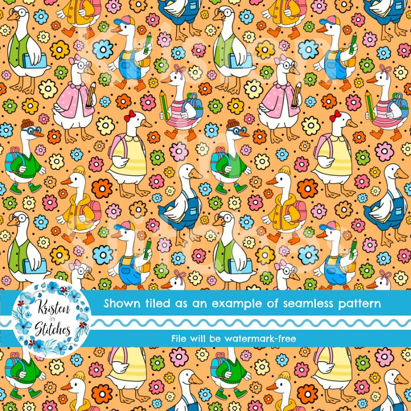 Cute geese are ready for their school days. A cute pattern for an elementary school teacher or librarian on marigold yellow.