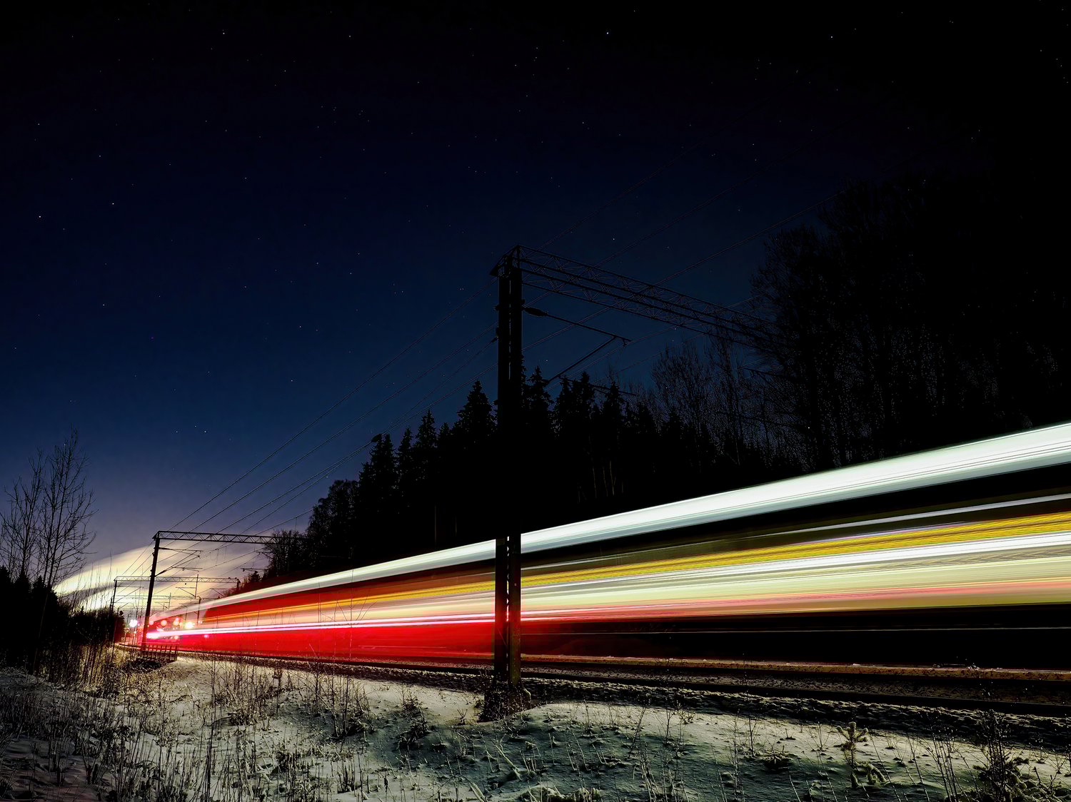 Electric train at speed at night. Night starry sky in the background. The light coming from the window of the passenger train illuminates the snowy landscape.