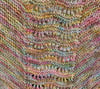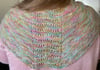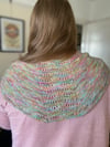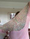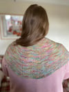 The shawl has a wide wingspan knitted in relaxing garter stitch coming from a central, simple lace panel and is designed to tie loosely around your shoulders. It is a gentle, repetitive pattern that is a joy to knit.