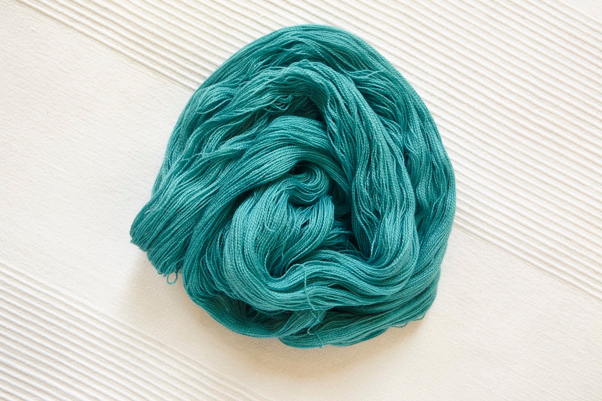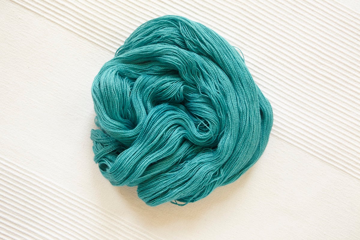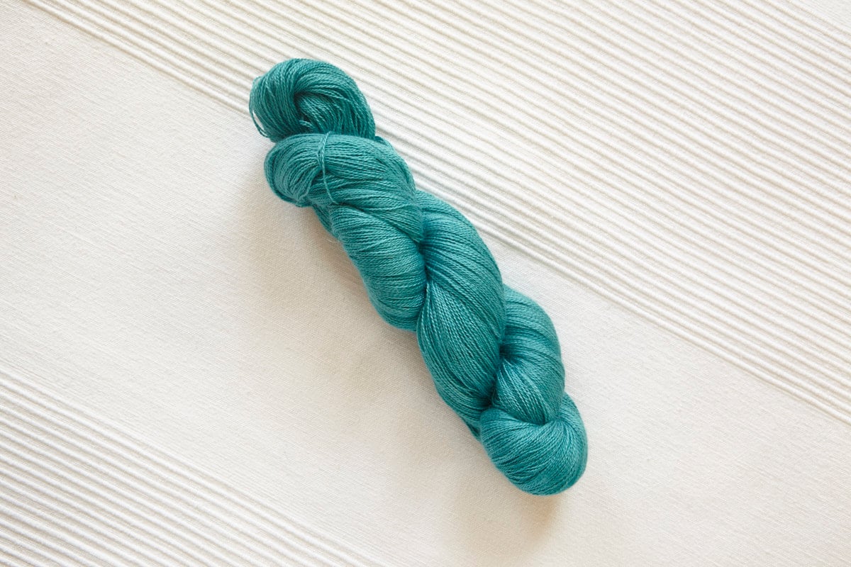Whisper (Lace) in colorway: Destination Teal. Tonal variegated. Medium blue-green (turquoise) with some sporadic variegation