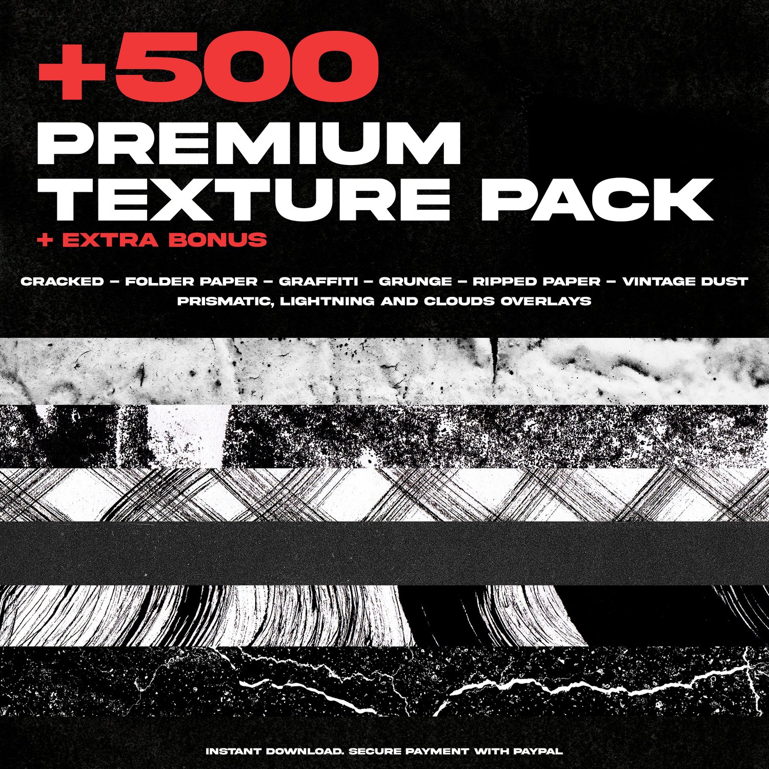 Introducing our ultimate PNG Texture Pack, a treasure trove for digital artists and designers alike. With over 500 meticulously curated textures in PNG format, this pack is a powerhouse of creative potential. But wait, there's more! We've also included a selection of bonus textures in popular styles such as Cracked, Folder Paper, Graffiti, Grunge, Ripped Paper, Vintage, Prismatic, along with Lightning and Clouds overlays.