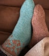 These cozy slipper socks are the perfect accessory for relaxing at home. They feature a Latvian braid edging and classic colorwork cuff combined with a comfortable stockinette foot. The main and contrast colors in the left and right socks are reversed to ensure efficient use of yarn quantities.