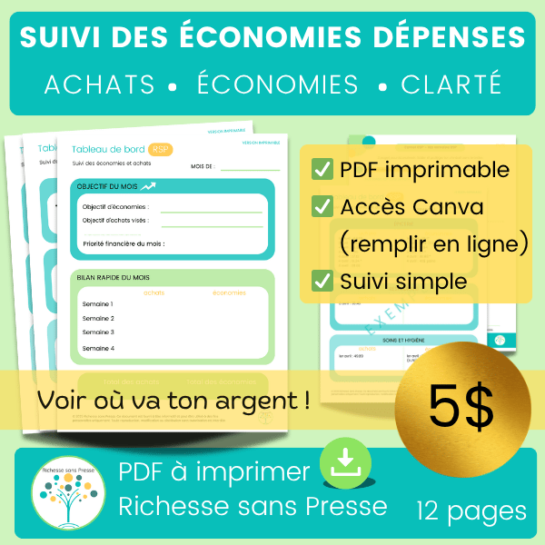 Le Canevas RSP – Suivi des économies et des dépenses est un outil simple, visuel et structuré pour t’aider à suivre concrètement ce que tu dépenses, ce que tu économises et les habitudes financières qui façonnent ton quotidien.