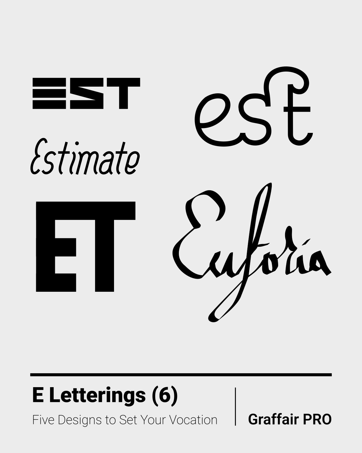 E Letterings (6): The 6th set of "E" logo/letterings with five original designs. These letterings are included among 800 other extraordinary ones in the "800 SVG Letterings" bundle edition.