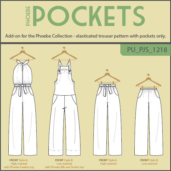 This is a complete pattern for the Phoebe Pants with pockets in high and low waist. It is intended to complement the original Phoebe Freebie and all the Add-ons, but is also an elastic waist trouser that can be made as a separate garment.